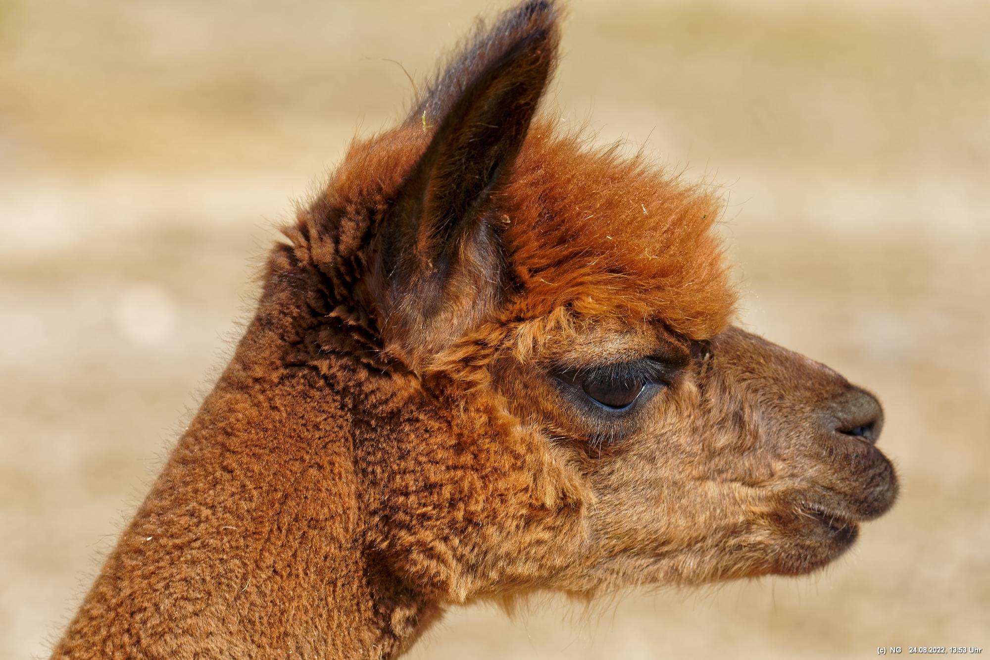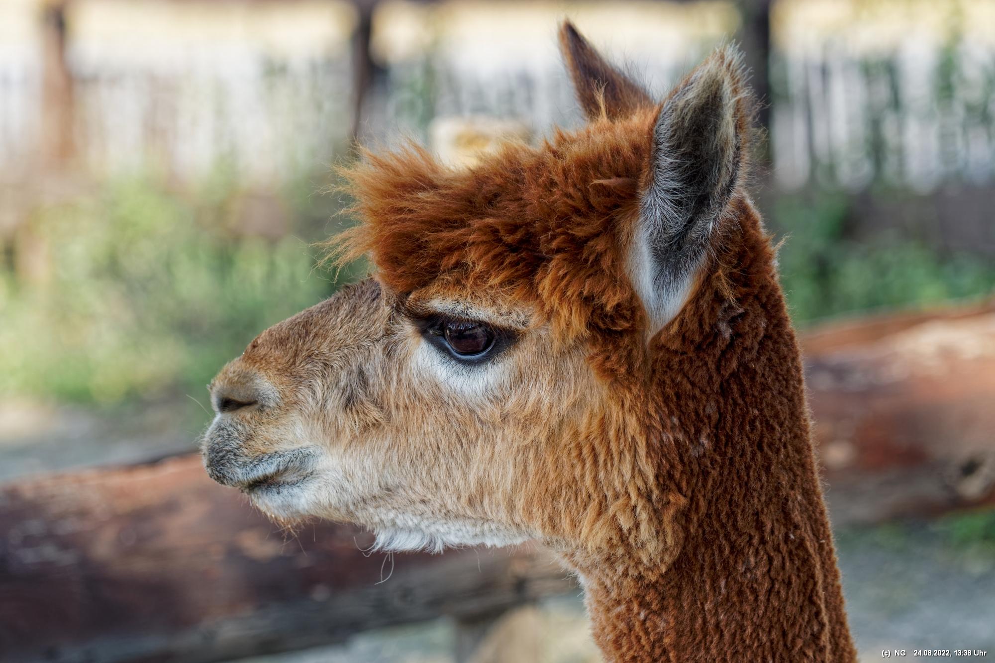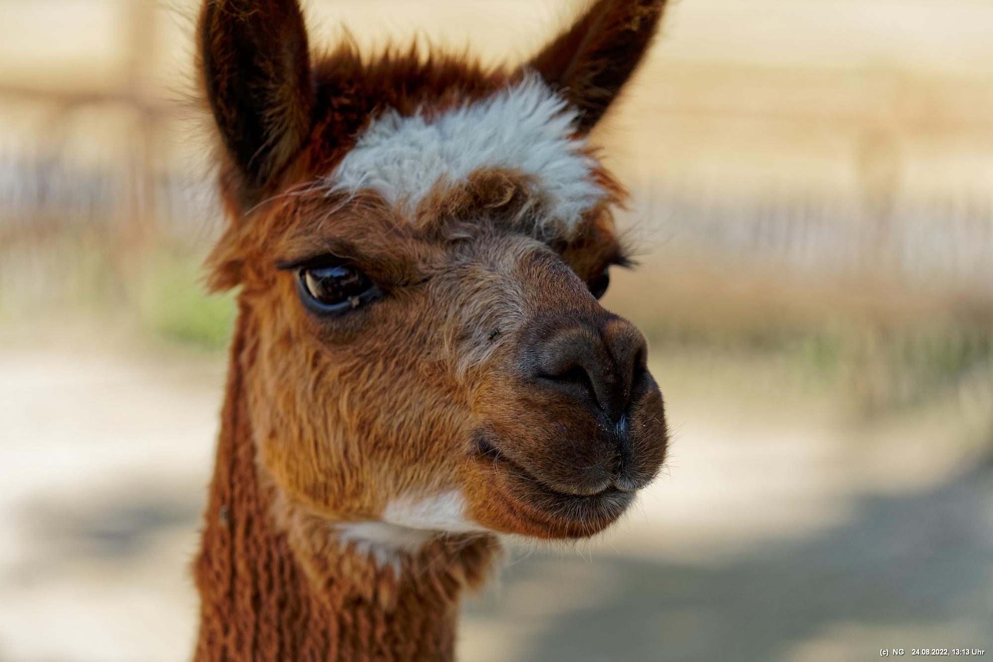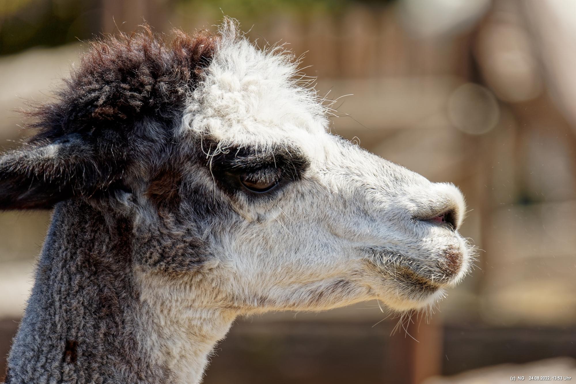 Ein Nachbar und Gassigänger hat auch noch eine kleine Alpakafarm. Mich zog es wieder dort hin. Wenn man sich den Tieren ruhig begegnet, ist die Neugier doch manchmal größer als der Fluchtinstinkt. Und so war ich mittendrin, hab mich beschnuppern lassen und konnte ihnen ins Auge sehen. Sie haben es zurzeit nicht leicht. Nach der langen Trockenheit ist auf den Wiesen nur noch Heu - und es ist für sie verdammt warm.