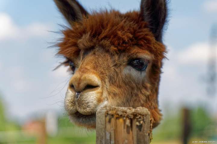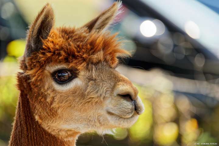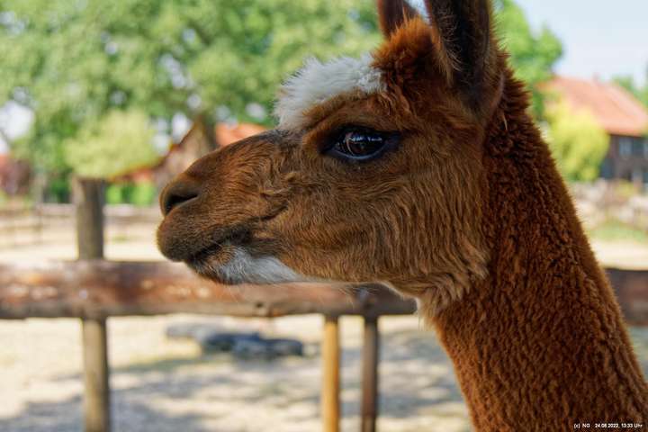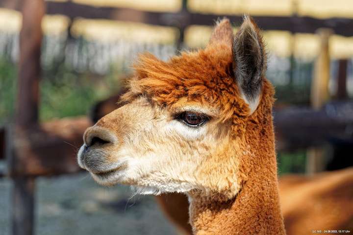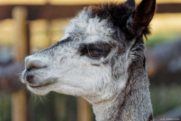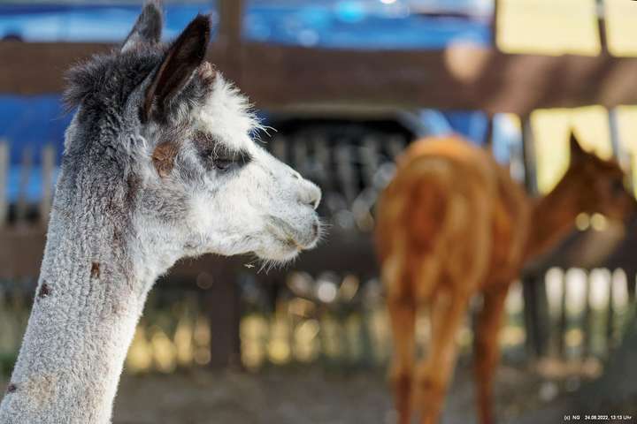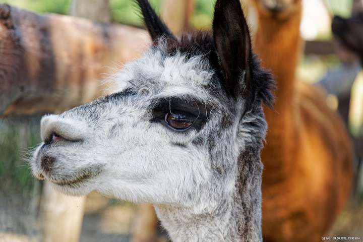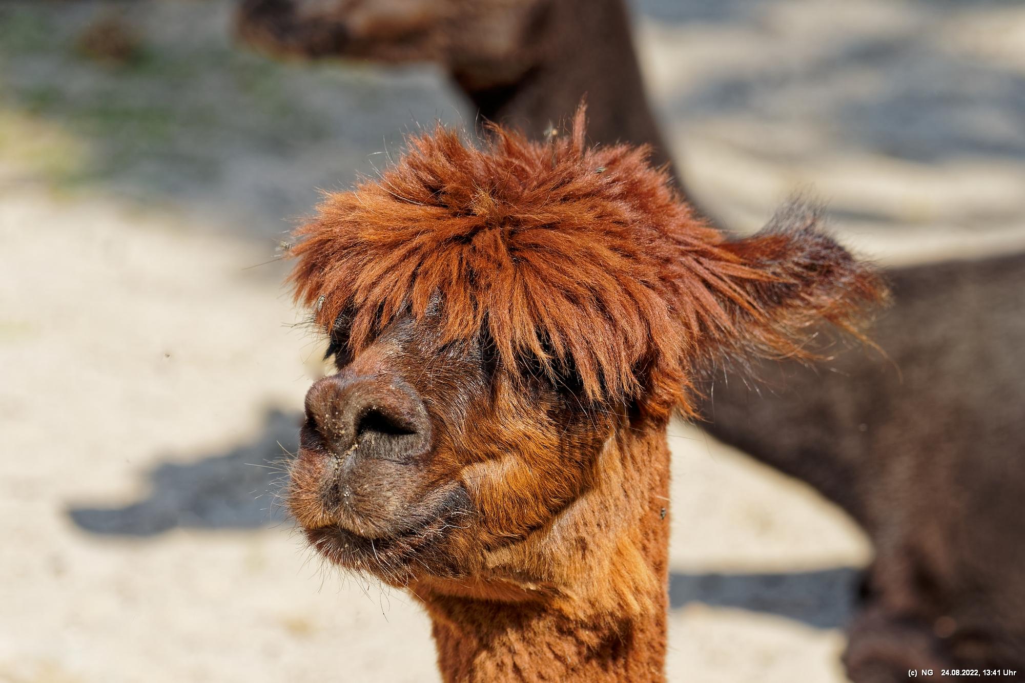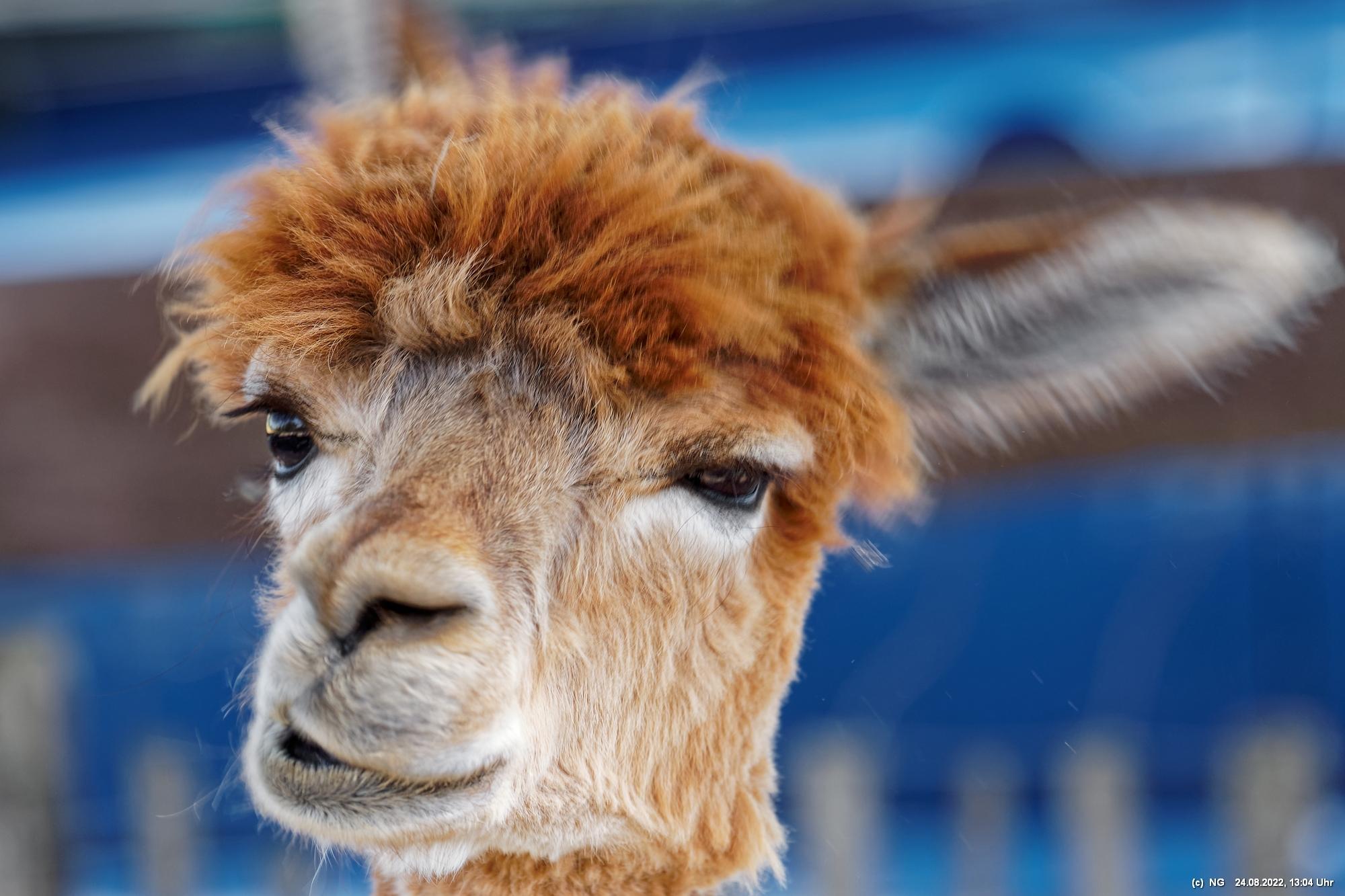Ein Nachbar und Gassigänger hat auch noch eine kleine Alpakafarm. Mich zog es wieder dort hin. Wenn man sich den Tieren ruhig begegnet, ist die Neugier doch manchmal größer als der Fluchtinstinkt. Und so war ich mittendrin, hab mich beschnuppern lassen und konnte ihnen ins Auge sehen. Sie haben es zurzeit nicht leicht. Nach der langen Trockenheit ist auf den Wiesen nur noch Heu - und es ist für sie verdammt warm.