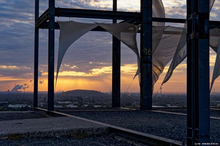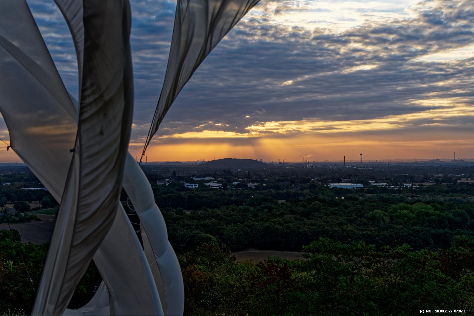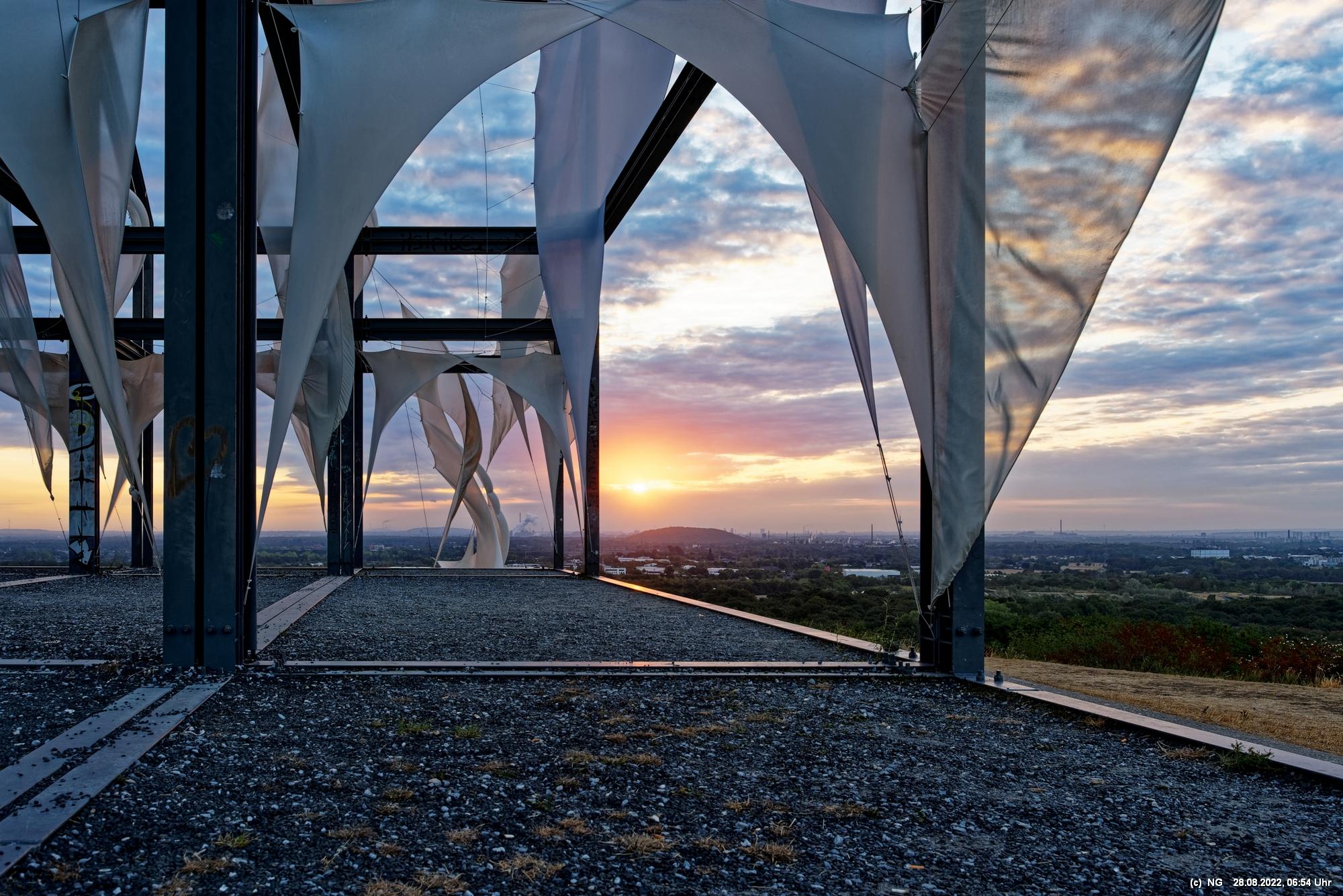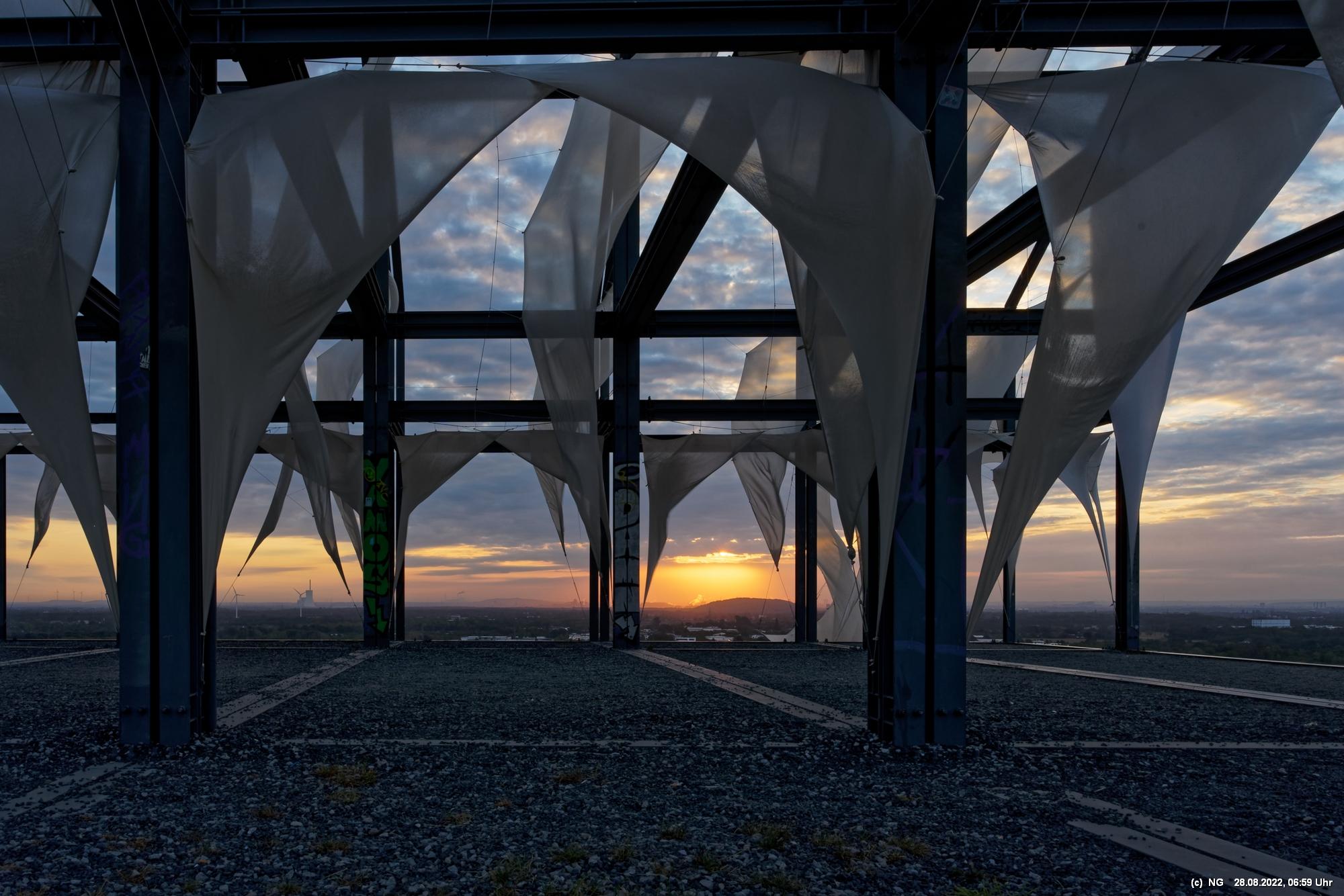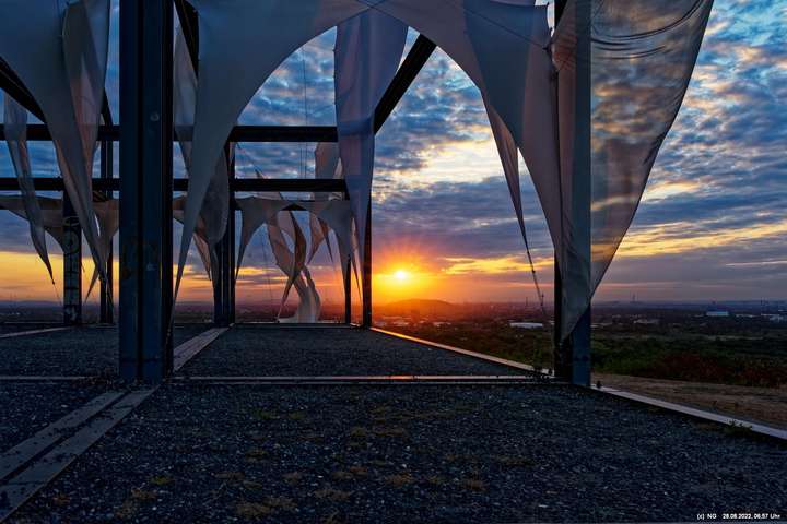 Das ist ungewöhnlich, beeindruckend und richtig gut! Auf der "brennenden Halde" war es kühl und windig. Die Tücher bewegten und gaben so dem ansonsten starren "Hallenhaus" eine völlig neue Bedeutung. Nachdem man die 359 Stufen überwunden hat, sieht man das leuchtende Gebilde schon von weitem und nähert sich fast bedächtig. Obwohl man schon viele Fotos davon gesehen hat, ist man überrascht. Leider war der angekündigte schöne Sonnenaufgang nicht so toll, weil die Sonne am Horizont mit Nebelwolken kämpfen musste.