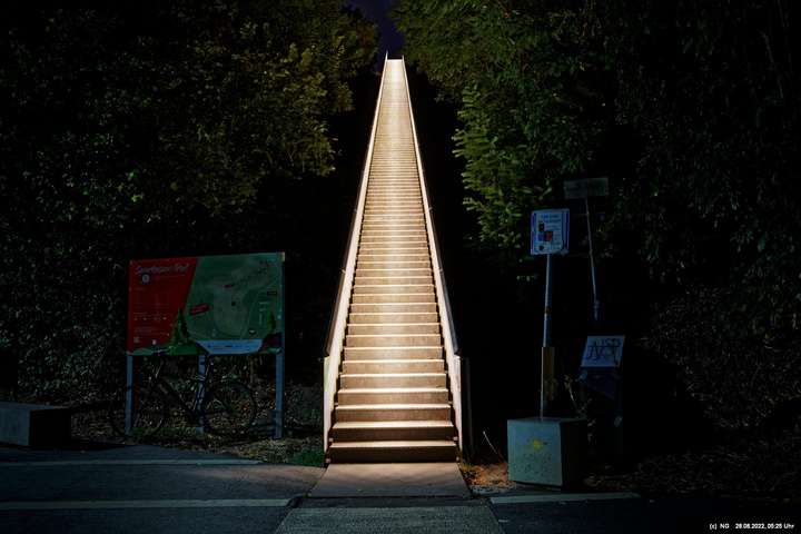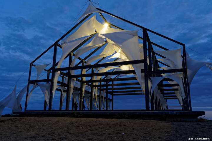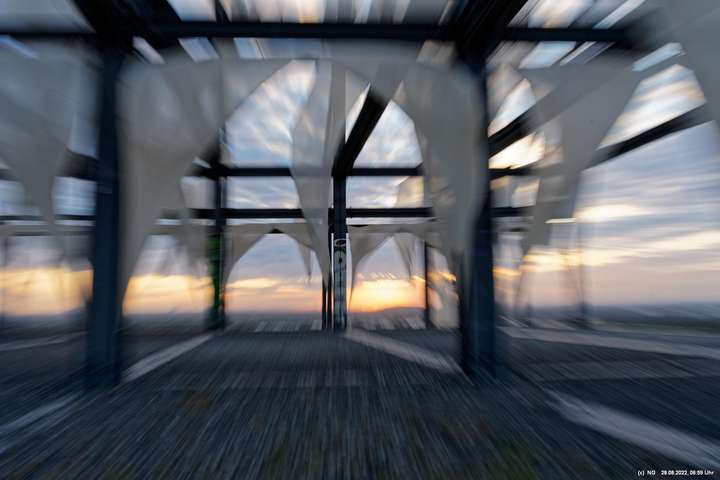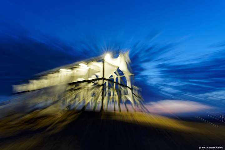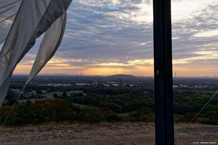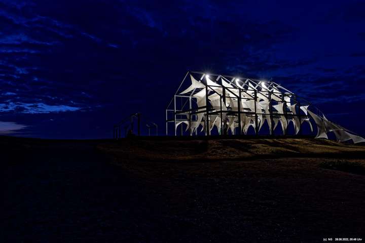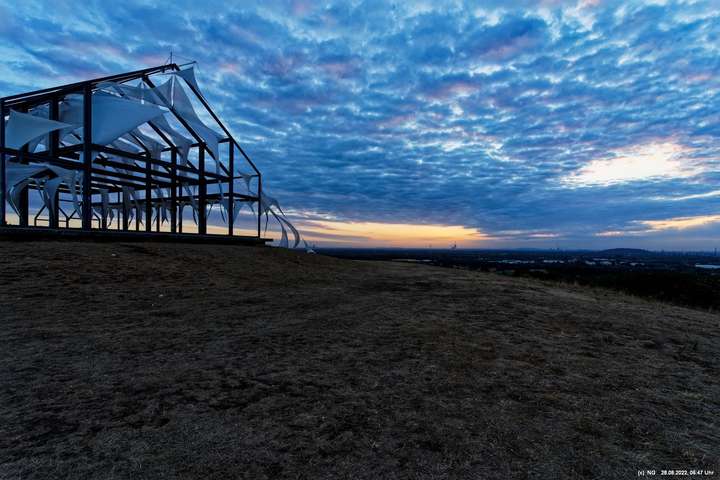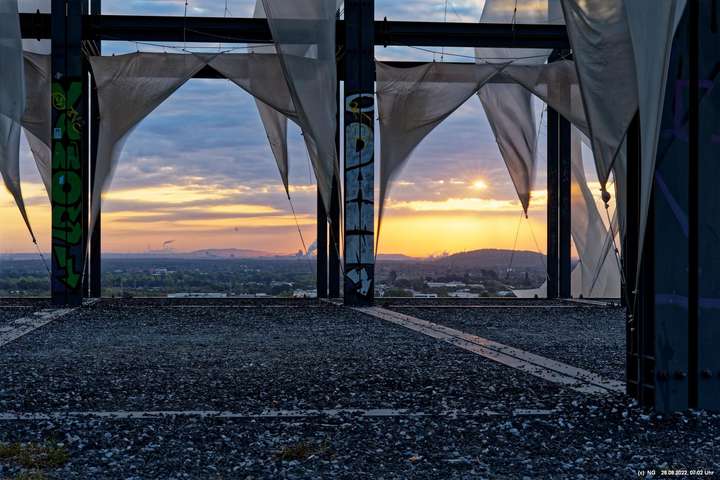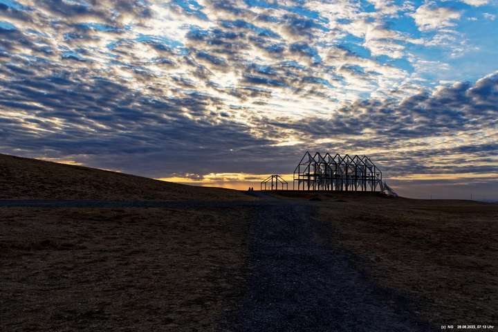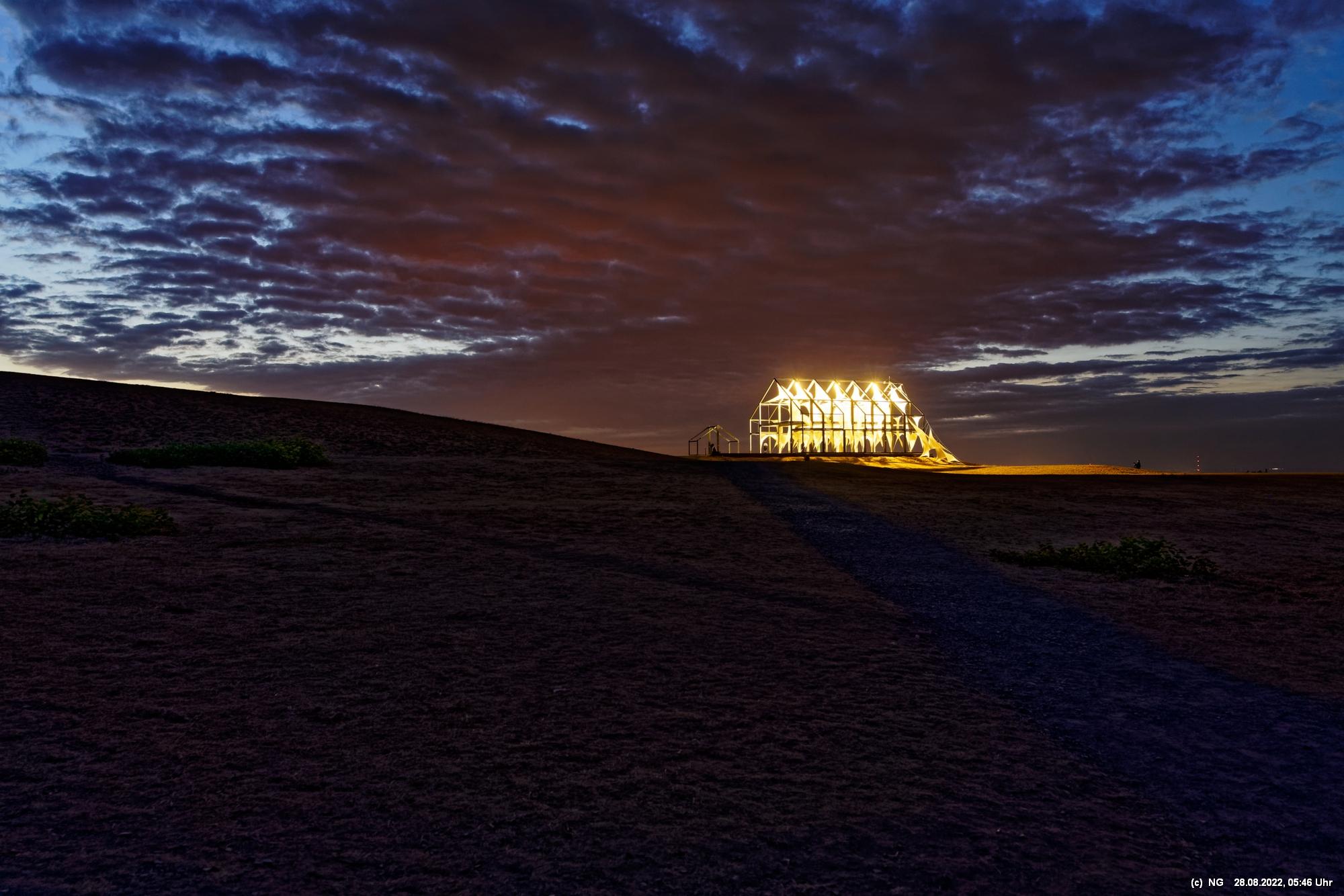 Das ist ungewöhnlich, beeindruckend und richtig gut! Auf der "brennenden Halde" war es kühl und windig. Die Tücher bewegten und gaben so dem ansonsten starren "Hallenhaus" eine völlig neue Bedeutung. Nachdem man die 359 Stufen überwunden hat, sieht man das leuchtende Gebilde schon von weitem und nähert sich fast bedächtig. Obwohl man schon viele Fotos davon gesehen hat, ist man überrascht. Leider war der angekündigte schöne Sonnenaufgang nicht so toll, weil die Sonne am Horizont mit Nebelwolken kämpfen musste.