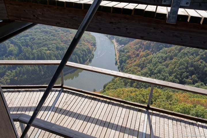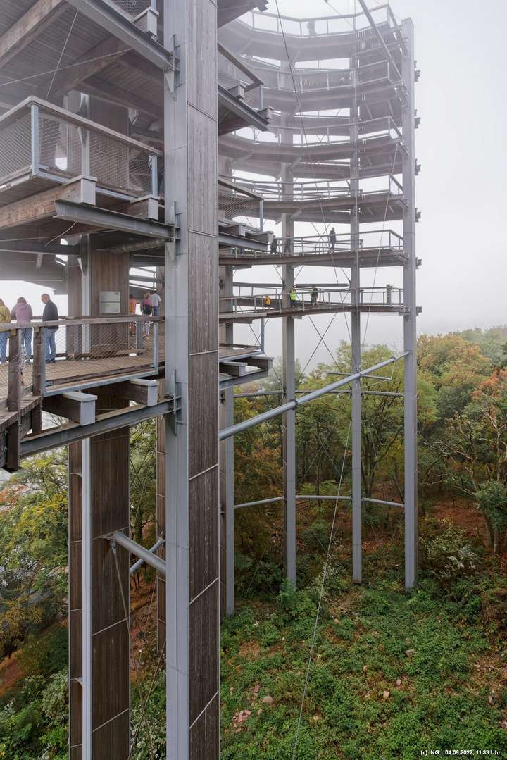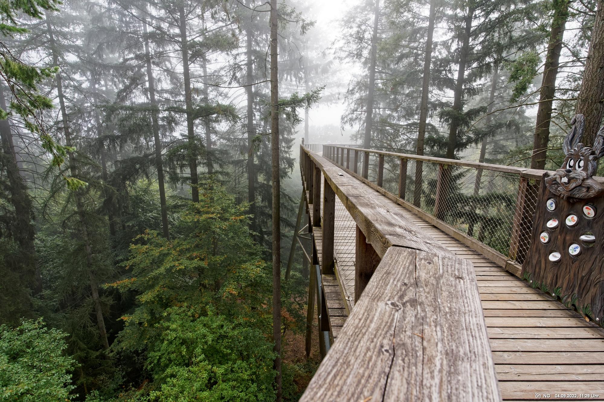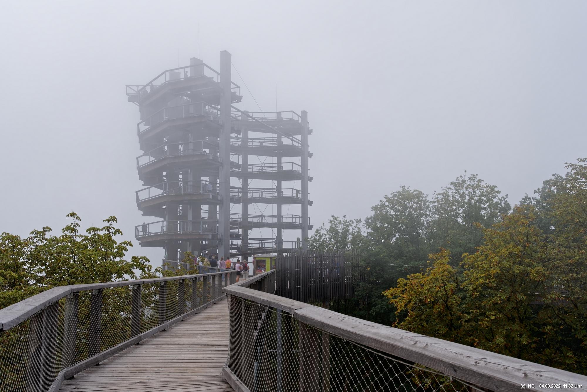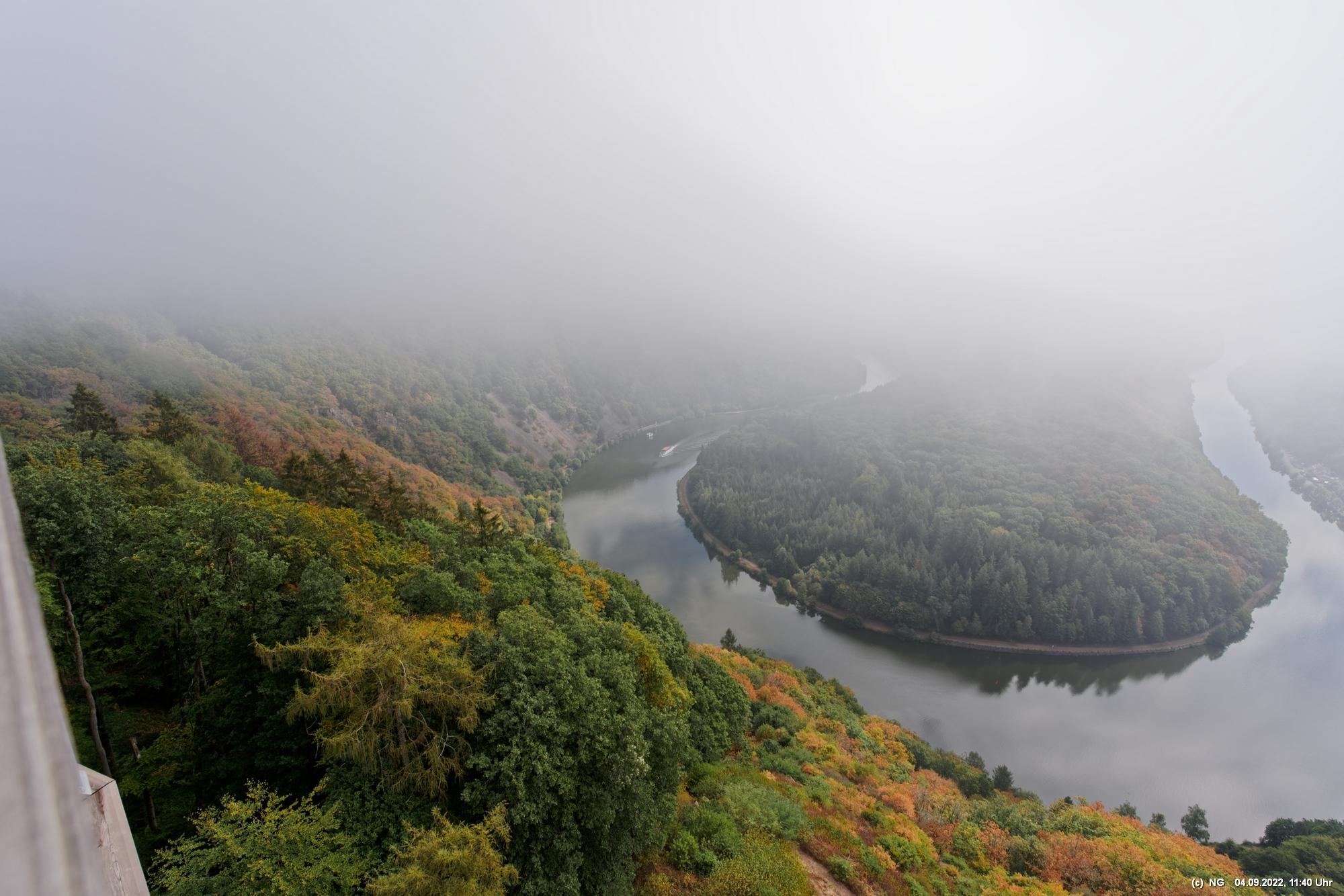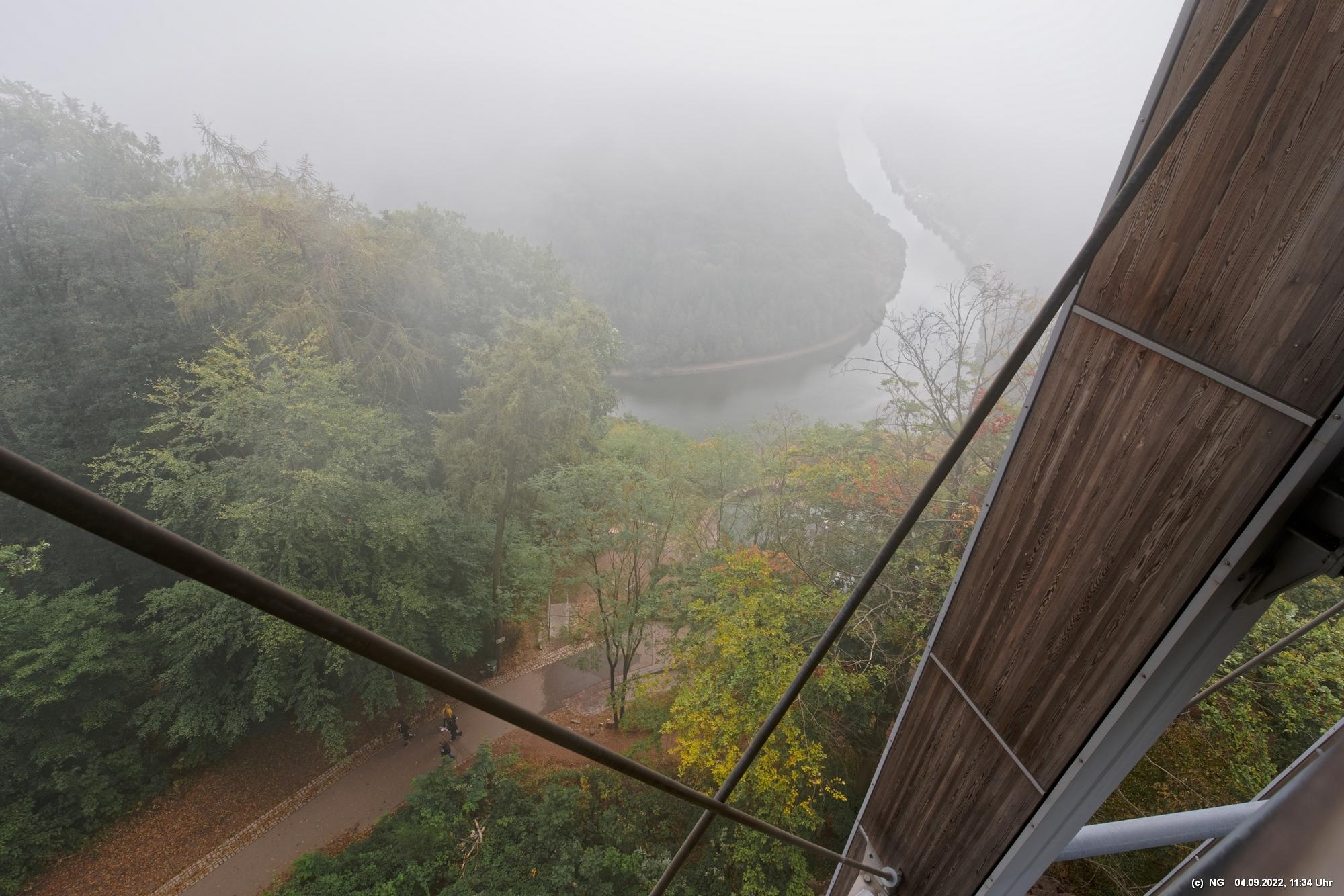 Die Saarschleife ist einzigartig. Von dem "alten" Aussichtspunkt "Cloef" (Klippe) in 180 m Höhe war sie schon beachtlich, aber von dem Aussichtsturm am Wendepunkt des Baumwipfelpfades ist sie noch viel schöner. Der Baumwipfelpfad ist 1.250 m lang und bis 23 m hoch. Der Aussichtsturm ist 42 m hoch. Der Aufstieg ist leicht, da die max. Steigung nur 6 % beträgt. Heute hatten wir allerdings Pech - es war stark nebelig. Barbara ging zuerst den Weg (da Hundeverbot mussten wir uns aufteilen) und hat kaum was gesehen. Danach bei mir kam so langsam die Sonne durch und der Nebel verzog sich. Da habe ich auch das Hausboot aus der WDR-Serie gesehen, mit dem die Sterneköche Björn Freitag (Dorsten) und Frank Buchholz (Mainz) darauf unterwegs sind.