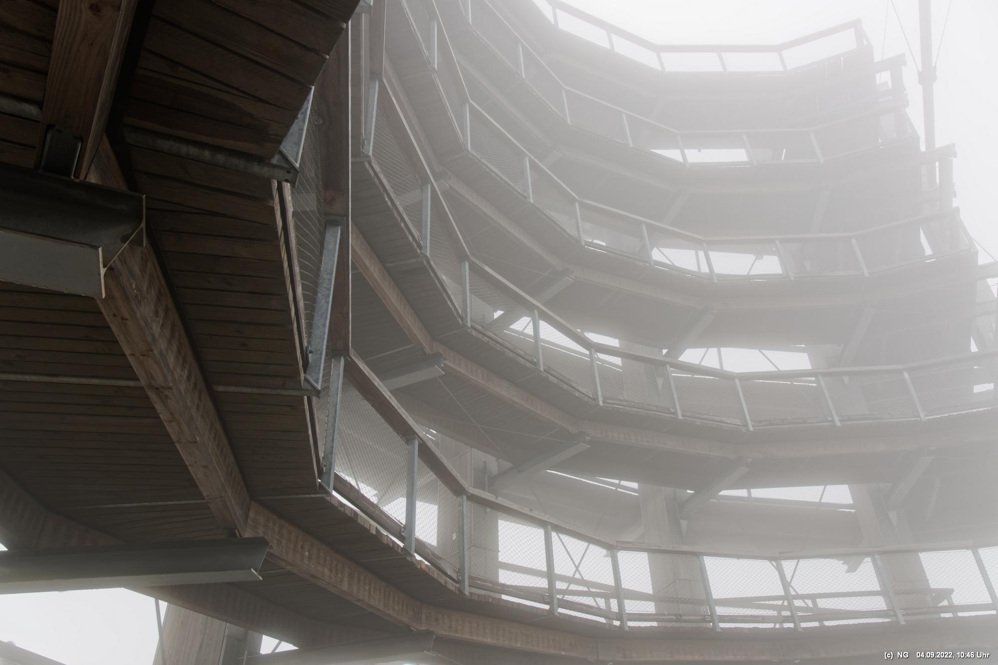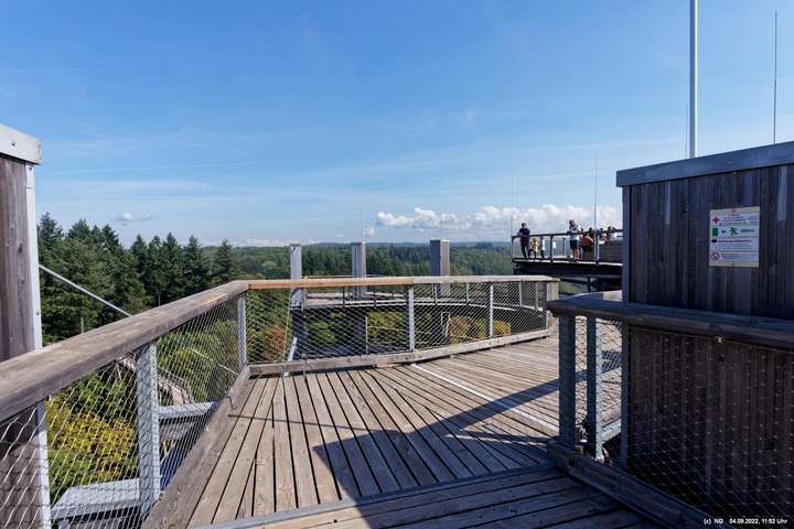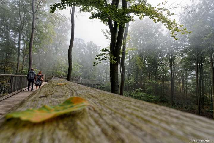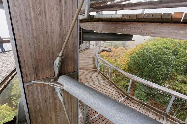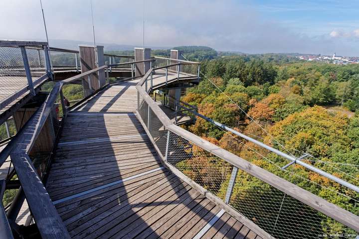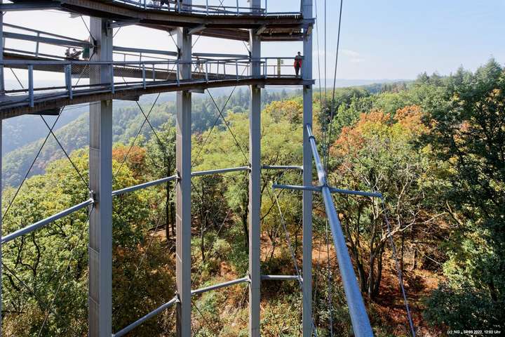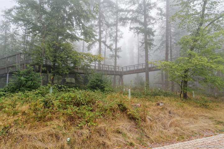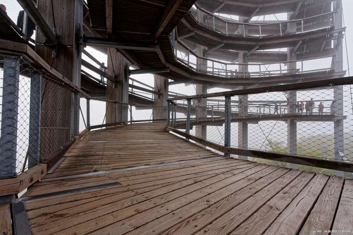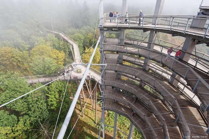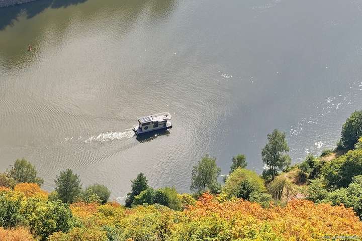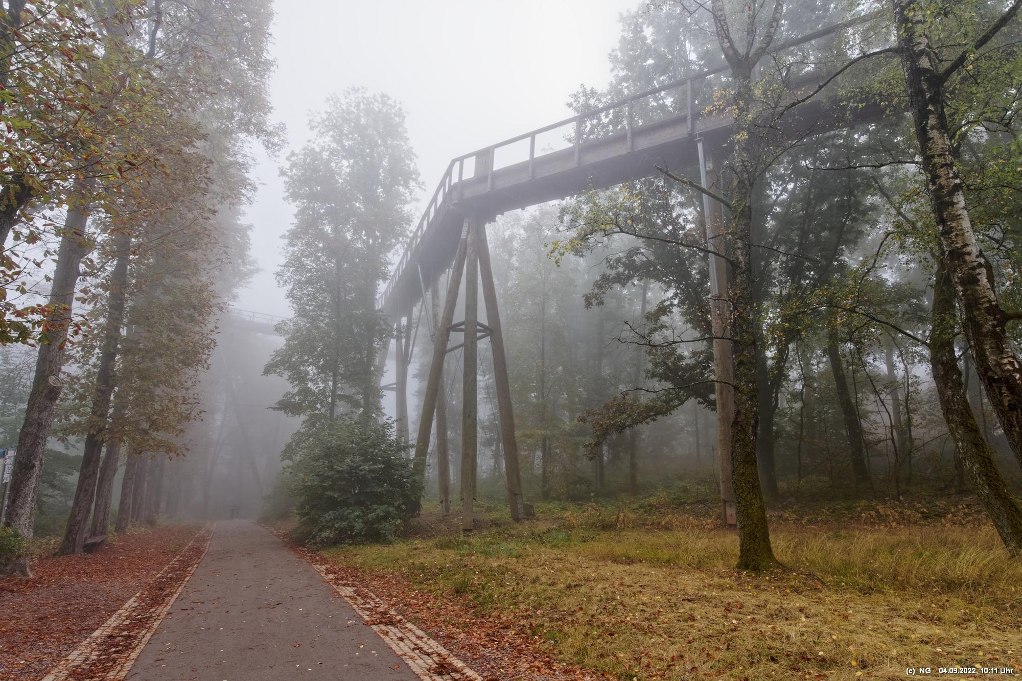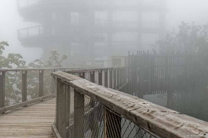 Die Saarschleife ist einzigartig. Von dem "alten" Aussichtspunkt "Cloef" (Klippe) in 180 m Höhe war sie schon beachtlich, aber von dem Aussichtsturm am Wendepunkt des Baumwipfelpfades ist sie noch viel schöner. Der Baumwipfelpfad ist 1.250 m lang und bis 23 m hoch. Der Aussichtsturm ist 42 m hoch. Der Aufstieg ist leicht, da die max. Steigung nur 6 % beträgt. Heute hatten wir allerdings Pech - es war stark nebelig. Barbara ging zuerst den Weg (da Hundeverbot mussten wir uns aufteilen) und hat kaum was gesehen. Danach bei mir kam so langsam die Sonne durch und der Nebel verzog sich. Da habe ich auch das Hausboot aus der WDR-Serie gesehen, mit dem die Sterneköche Björn Freitag (Dorsten) und Frank Buchholz (Mainz) darauf unterwegs sind.