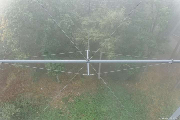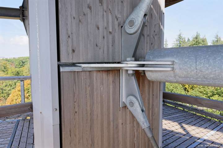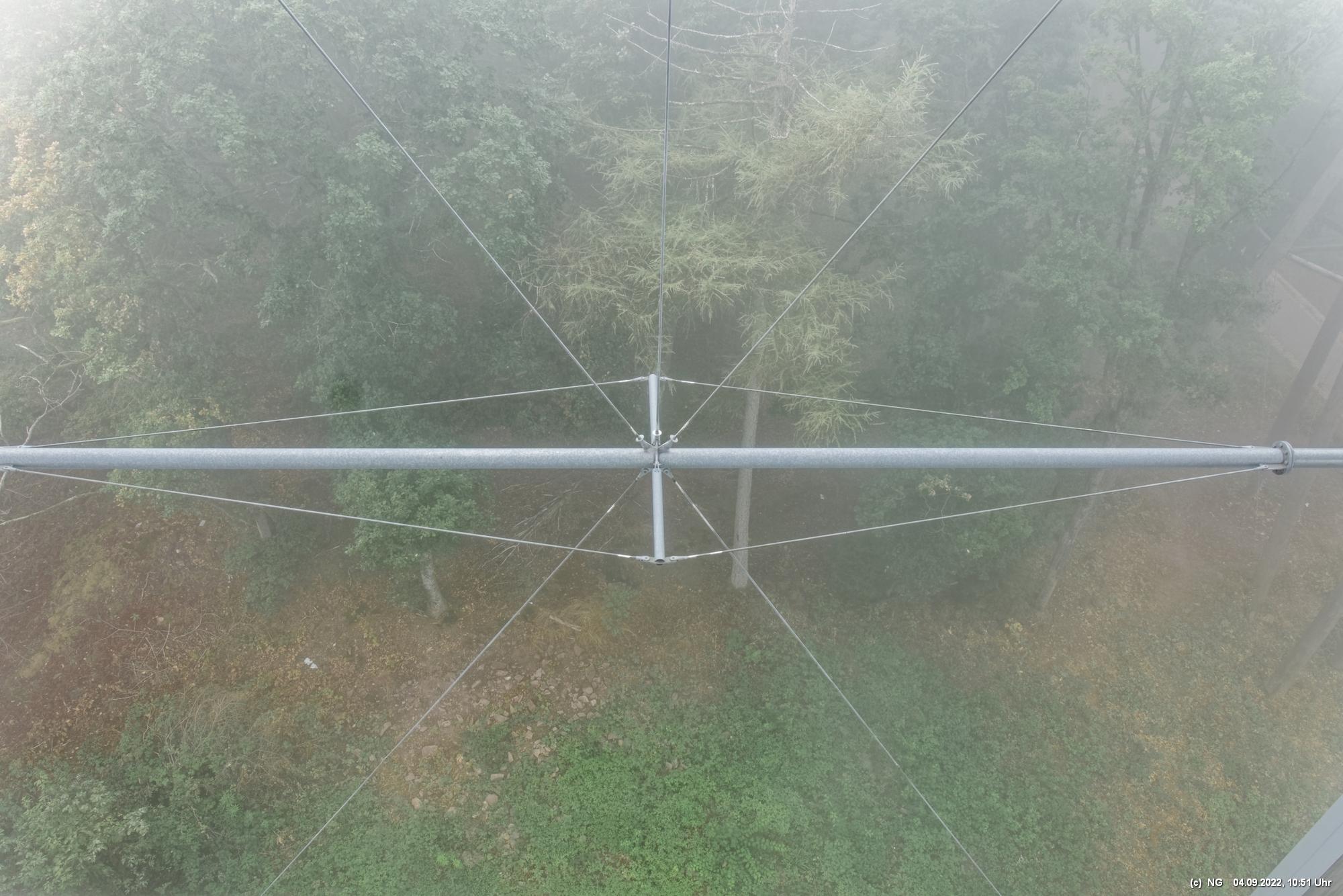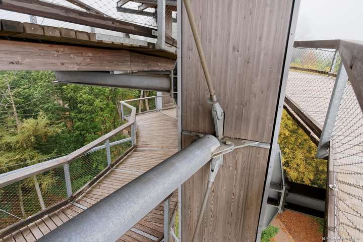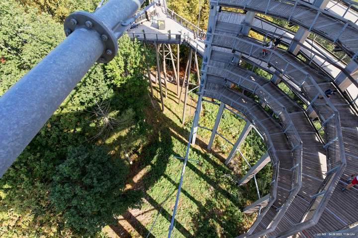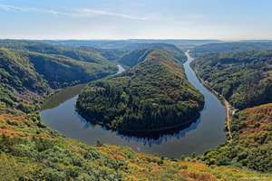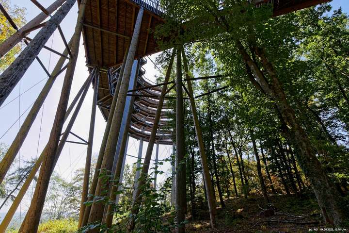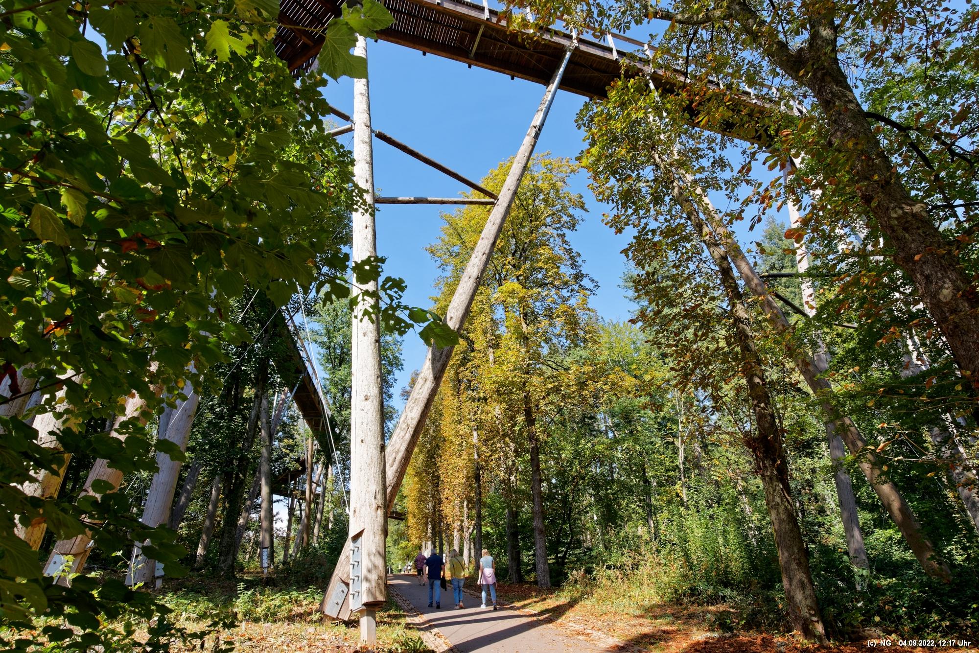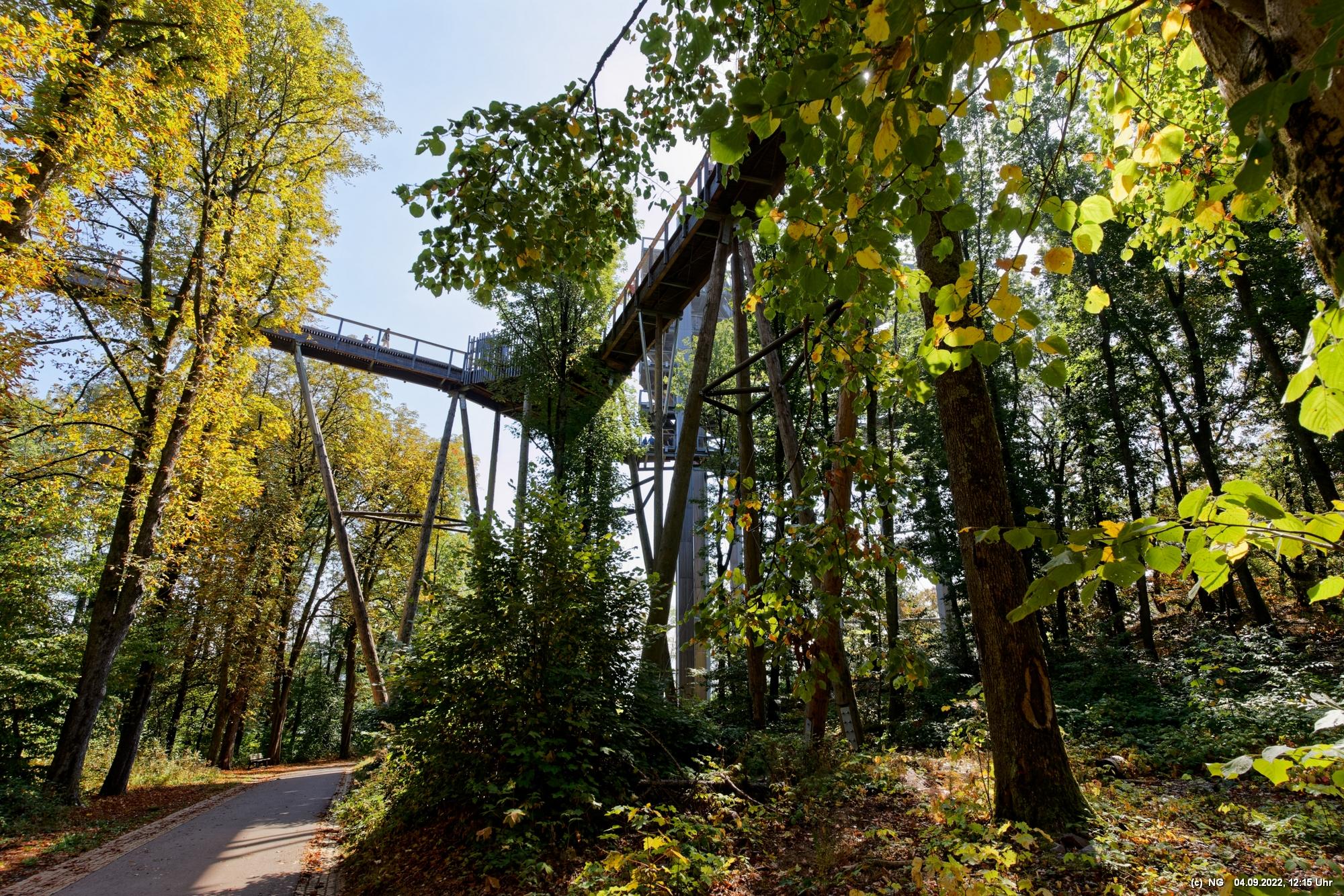 Die Saarschleife ist einzigartig. Von dem "alten" Aussichtspunkt "Cloef" (Klippe) in 180 m Höhe war sie schon beachtlich, aber von dem Aussichtsturm am Wendepunkt des Baumwipfelpfades ist sie noch viel schöner. Der Baumwipfelpfad ist 1.250 m lang und bis 23 m hoch. Der Aussichtsturm ist 42 m hoch. Der Aufstieg ist leicht, da die max. Steigung nur 6 % beträgt. Heute hatten wir allerdings Pech - es war stark nebelig. Barbara ging zuerst den Weg (da Hundeverbot mussten wir uns aufteilen) und hat kaum was gesehen. Danach bei mir kam so langsam die Sonne durch und der Nebel verzog sich. Da habe ich auch das Hausboot aus der WDR-Serie gesehen, mit dem die Sterneköche Björn Freitag (Dorsten) und Frank Buchholz (Mainz) darauf unterwegs sind.