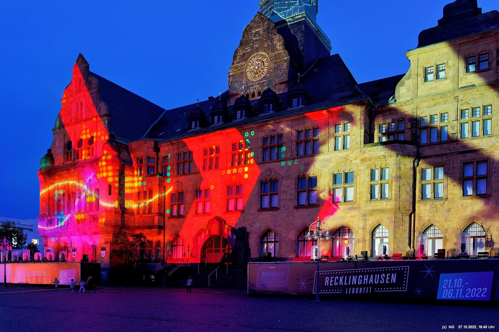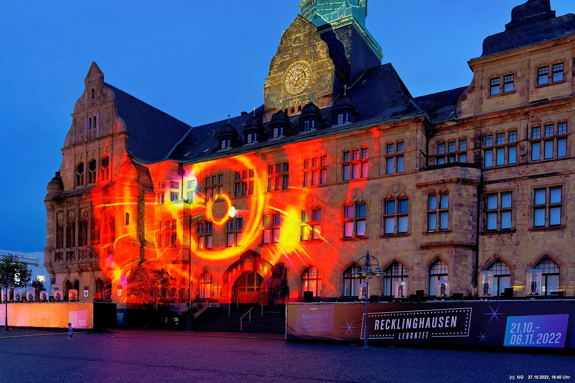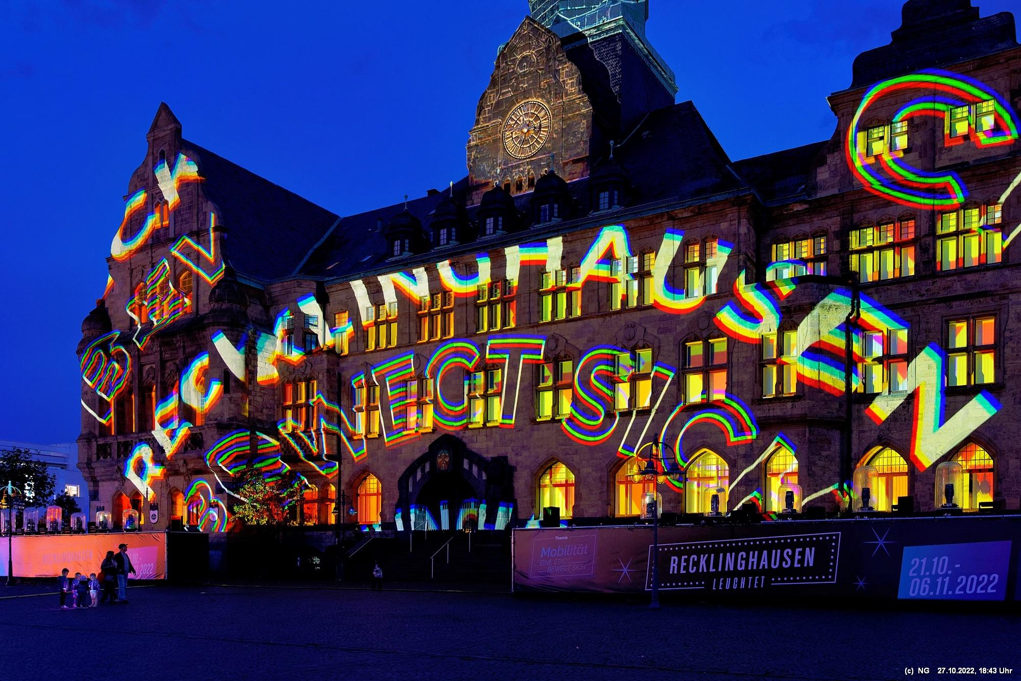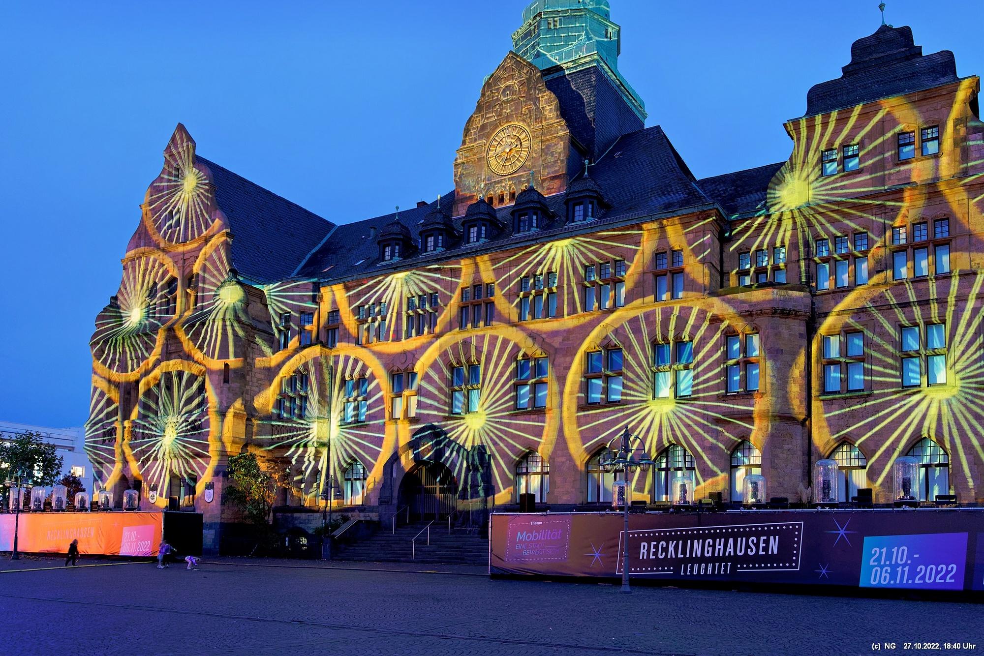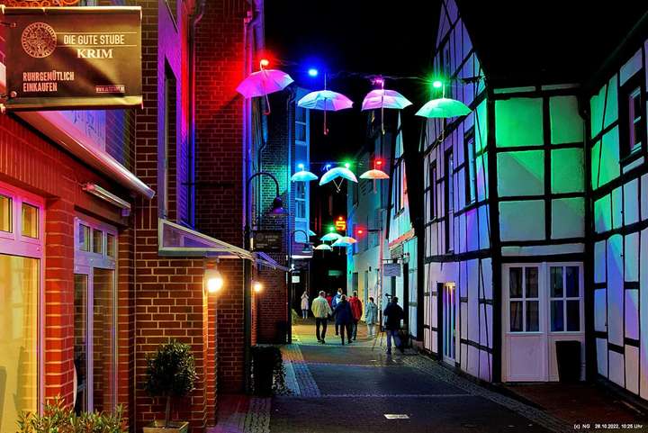 In diesem Herbst geht es um das Thema "Mobilität". „Recklinghausen leuchtet“ findet mitten in der Energiekrise statt. Wie kann das? Die Beleuchtung wird in diesem Jahr zwar früher ausgeschaltet, aber im Recklinghäuser Hafen hat man vorgesorgt. Dort wurde eine Solaranlage aufgebaut, die den Strom für das Event produziert. Damit ist die Veranstaltung nicht nur Klimaneutral, sondern es wird auch noch 50% mehr produziert, als in einem Jahr verbraucht wird. Also unbeschwert losgehen in die prächtige Stimmung der Altstadt. Wir haben lecker gegessen und mit rund 3,5 km nur einen kleinen Rundgang gemacht, also bei Weitem nicht alles gesehen.