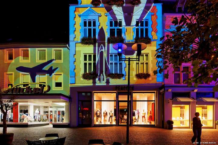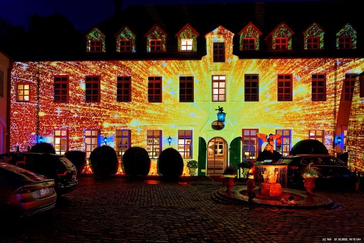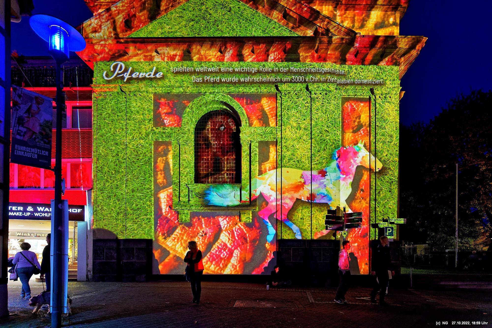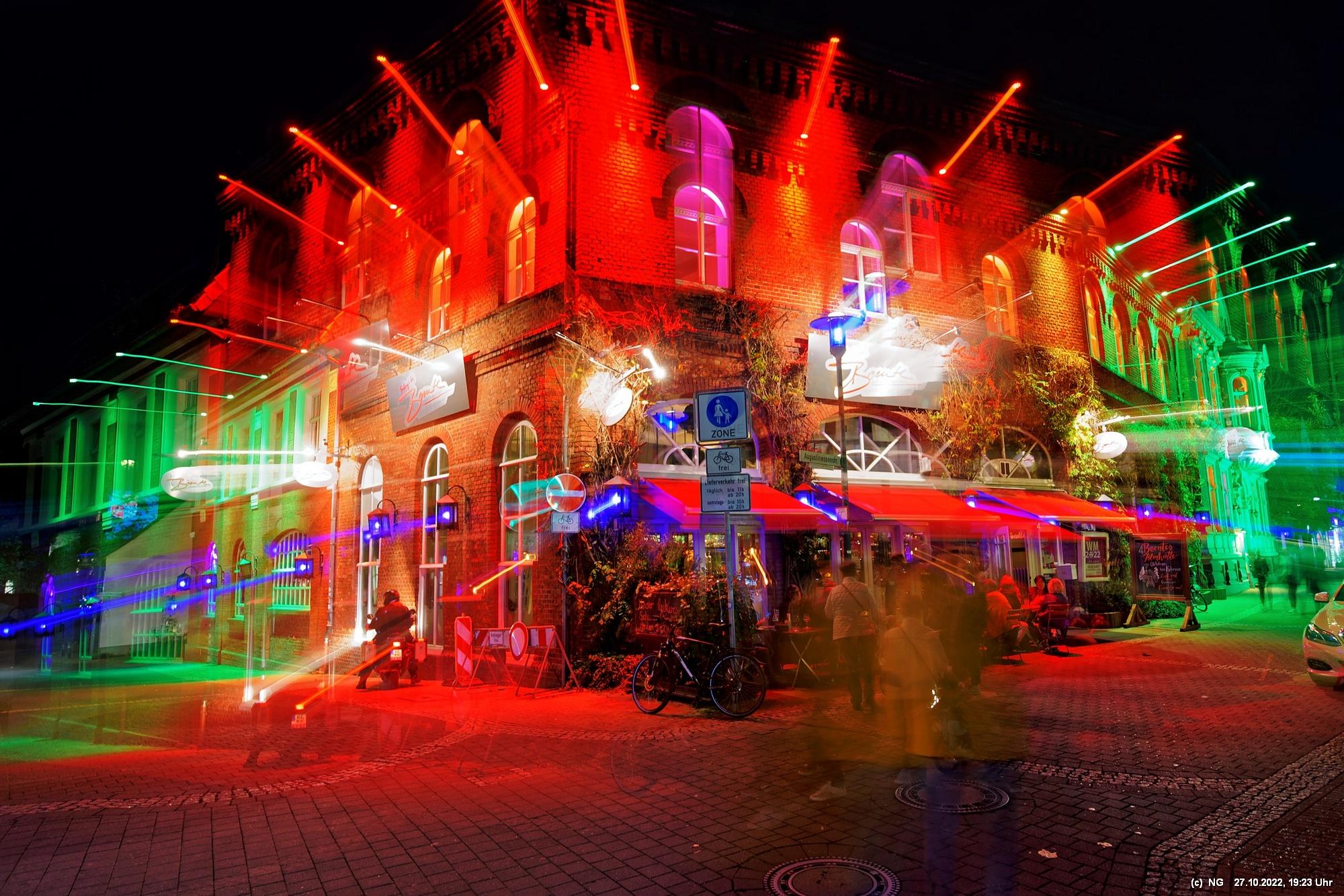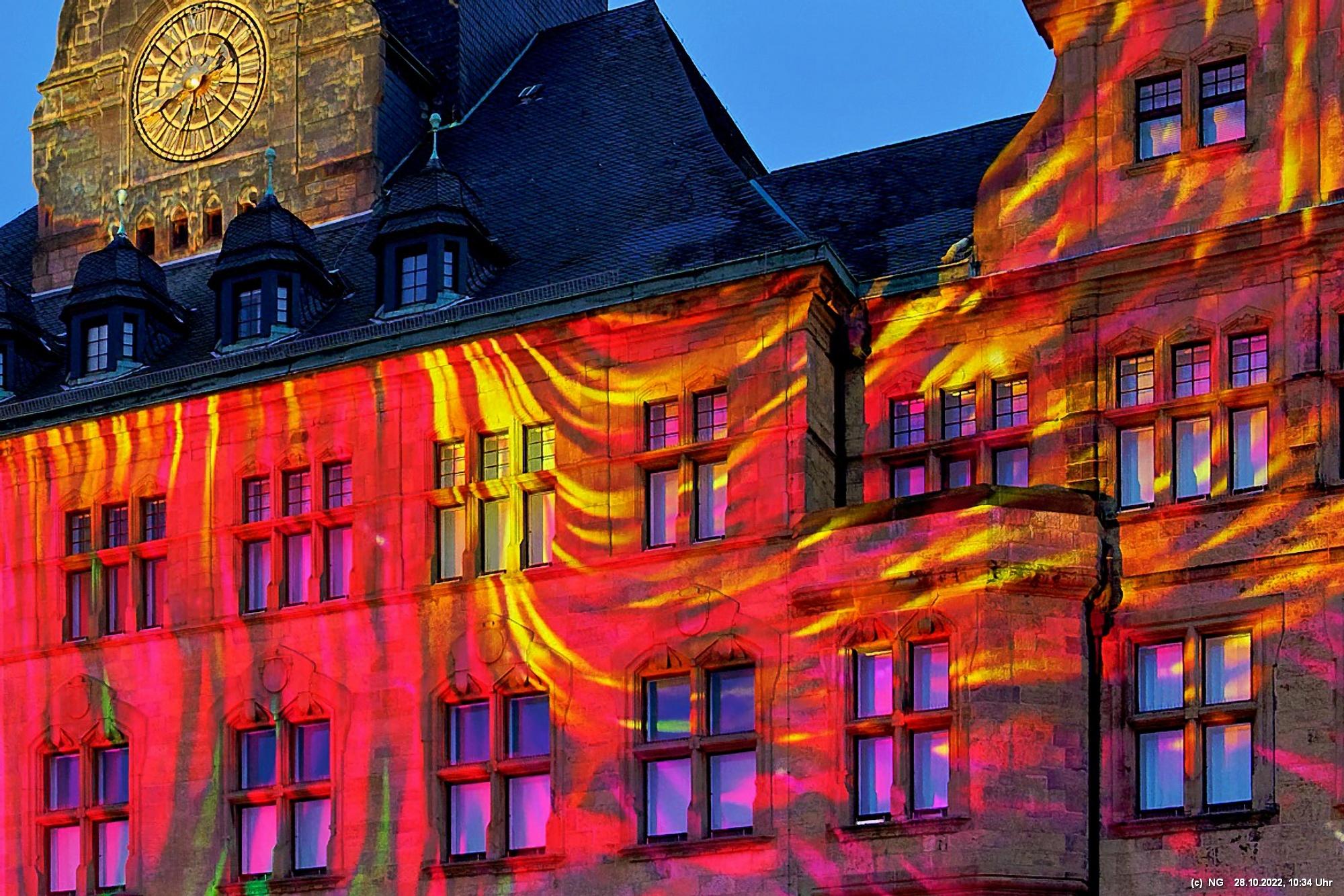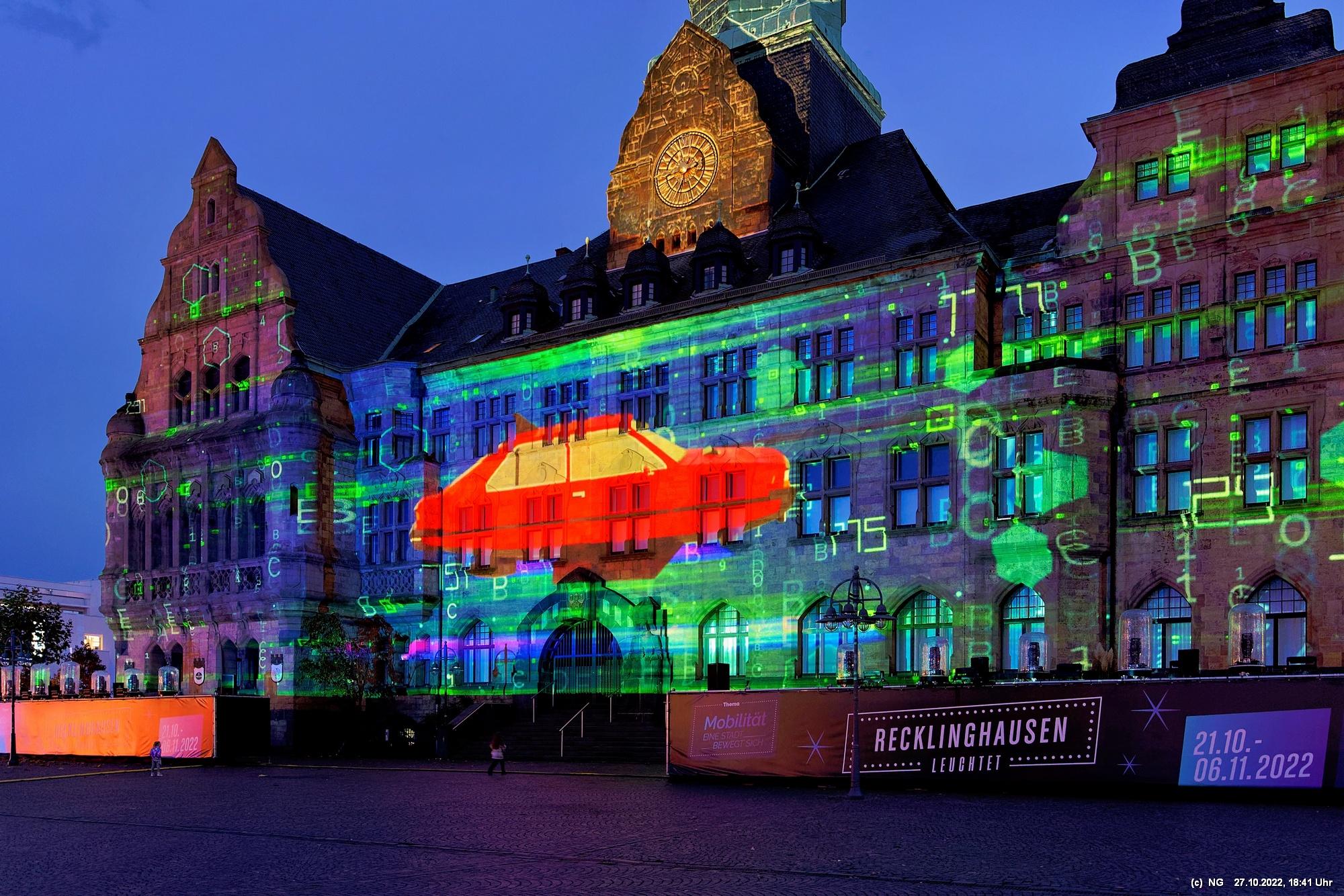 In diesem Herbst geht es um das Thema "Mobilität". „Recklinghausen leuchtet“ findet mitten in der Energiekrise statt. Wie kann das? Die Beleuchtung wird in diesem Jahr zwar früher ausgeschaltet, aber im Recklinghäuser Hafen hat man vorgesorgt. Dort wurde eine Solaranlage aufgebaut, die den Strom für das Event produziert. Damit ist die Veranstaltung nicht nur Klimaneutral, sondern es wird auch noch 50% mehr produziert, als in einem Jahr verbraucht wird. Also unbeschwert losgehen in die prächtige Stimmung der Altstadt. Wir haben lecker gegessen und mit rund 3,5 km nur einen kleinen Rundgang gemacht, also bei Weitem nicht alles gesehen.