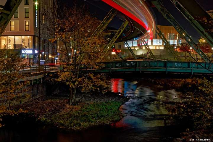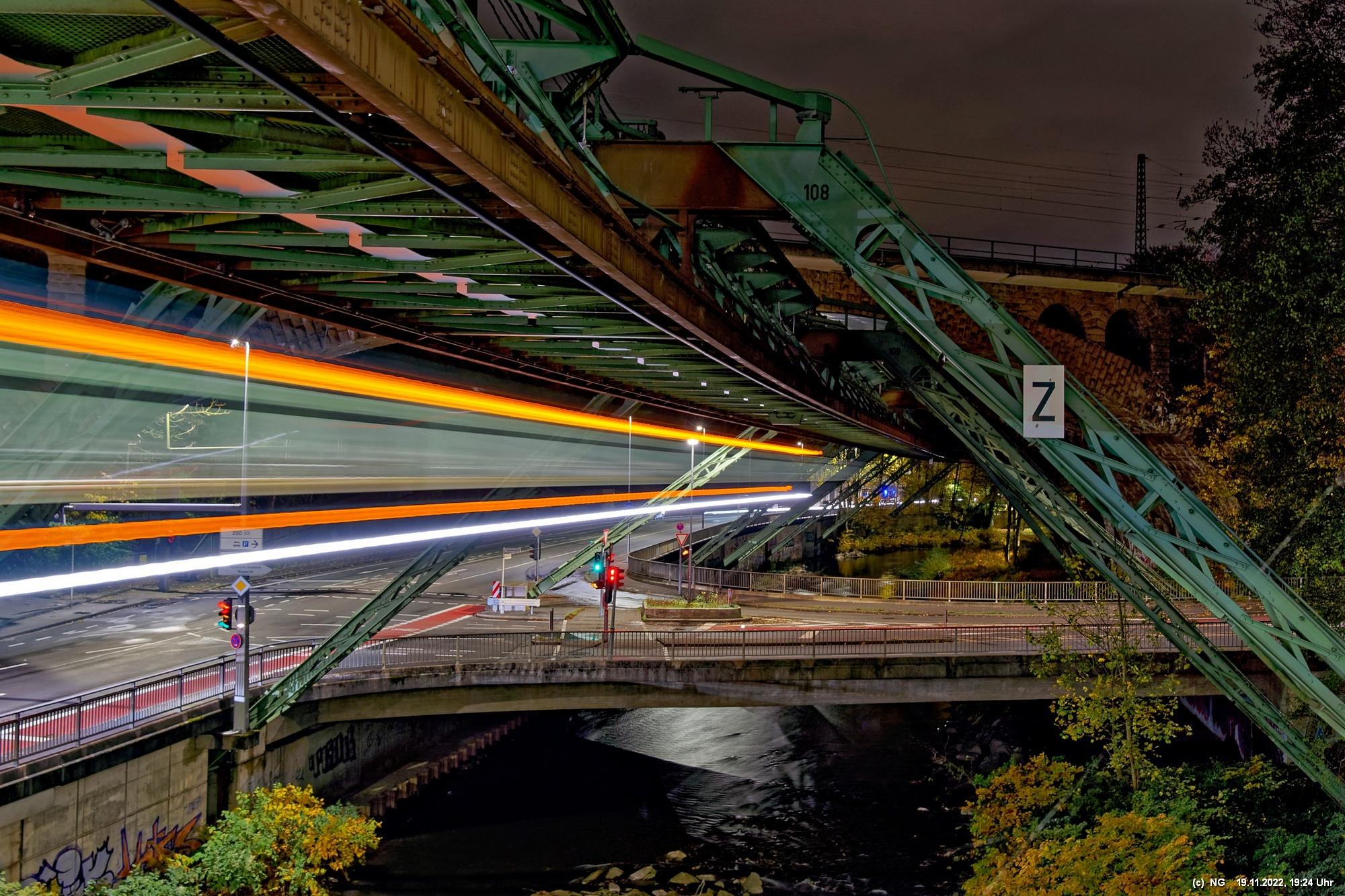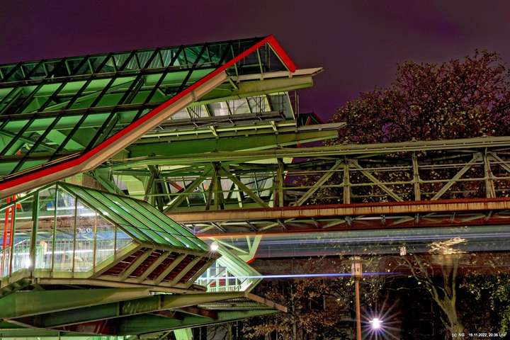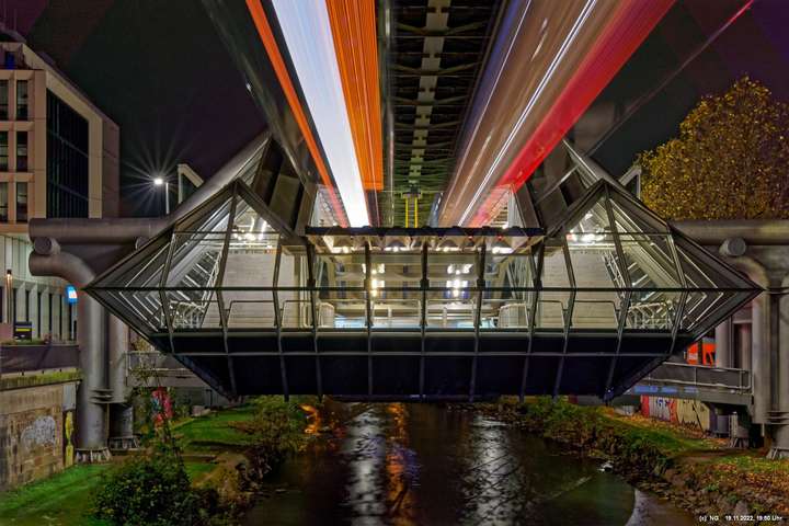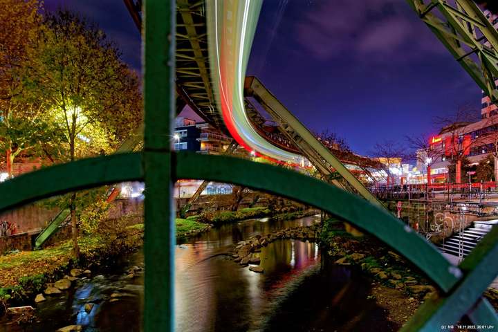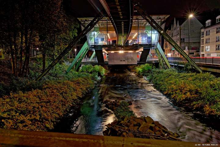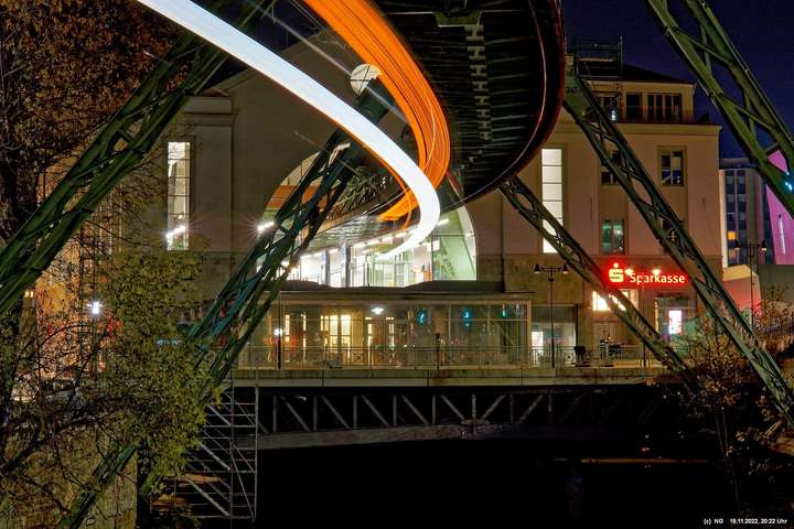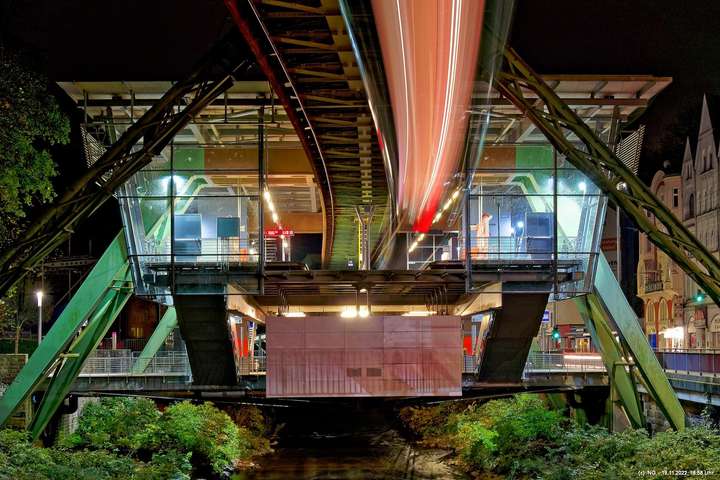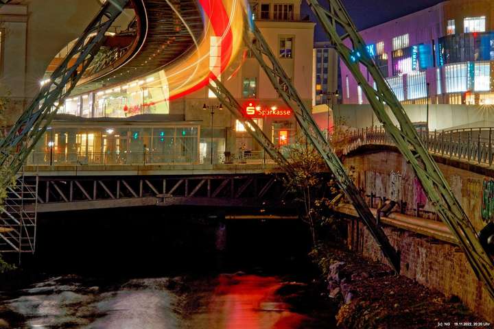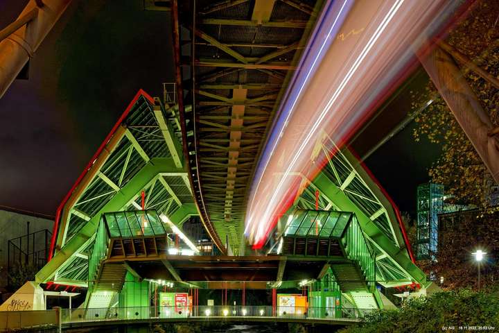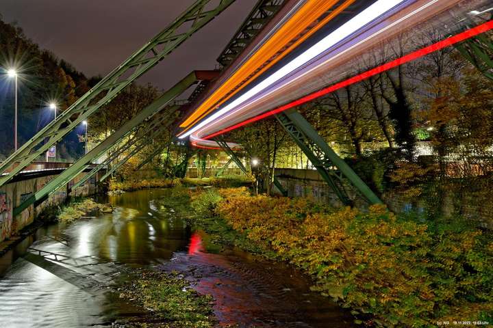 Sie wurde in 1901 als Hochbahn eröffnet. Die rund 13 km lange Strecke führt meist direkt über der Wupper und wird durch 20 Bahnhöfe in rund 35 Minuten abgefahren. Dann geht's wieder zurück. Täglich nutzen rund 80.000 Fahrgäste die Schwebebahn, die eigentlich nicht schwebt, sondern hängend über Schienen fährt. Mit der Fotogruppe "Revierblicke" haben wir bei leichtem Frost der Schwebebahn einen nächtlichen Besuch abgestattet.