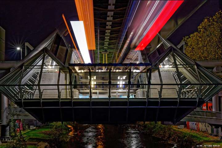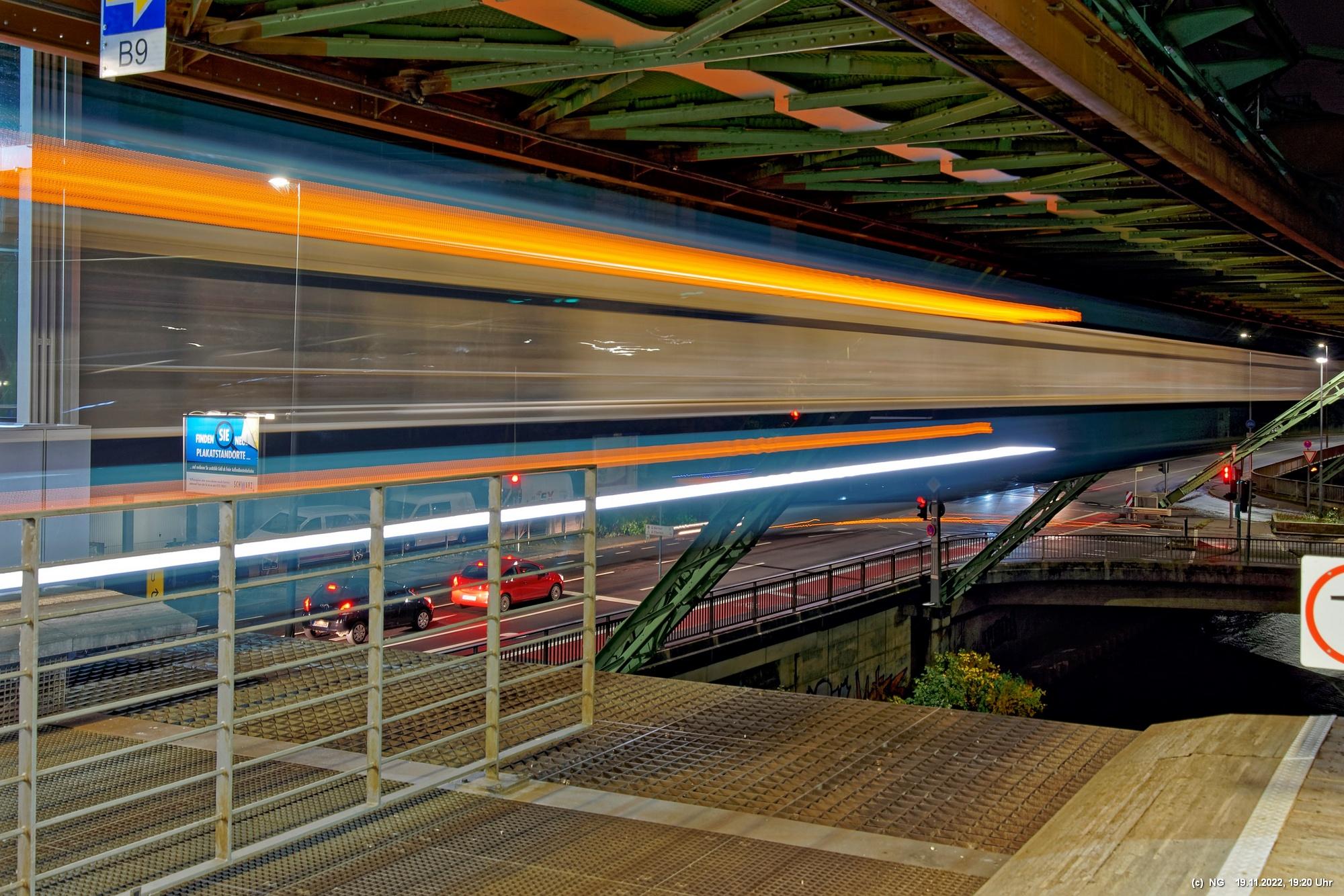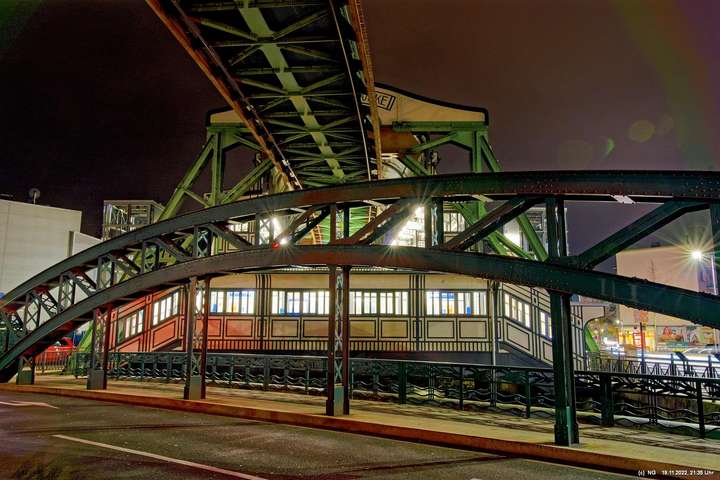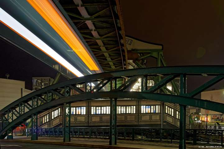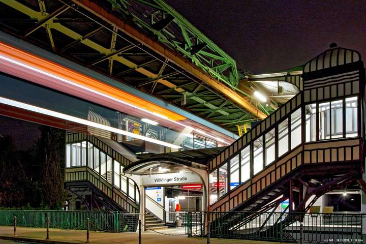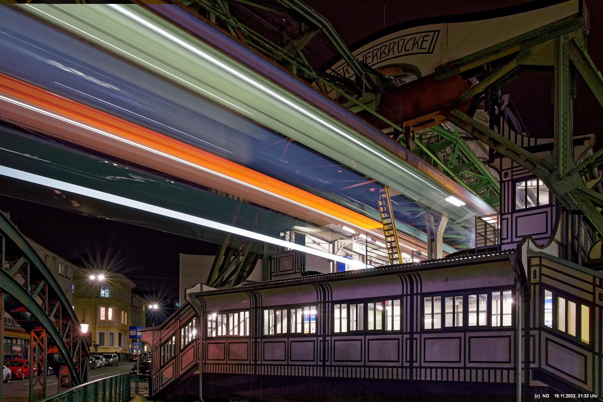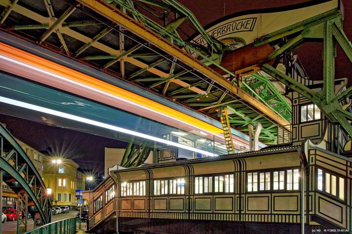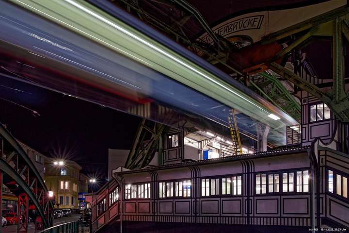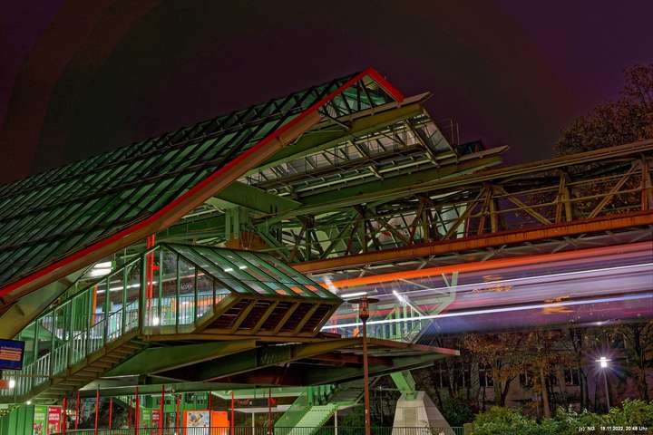 Sie wurde in 1901 als Hochbahn eröffnet. Die rund 13 km lange Strecke führt meist direkt über der Wupper und wird durch 20 Bahnhöfe in rund 35 Minuten abgefahren. Dann geht's wieder zurück. Täglich nutzen rund 80.000 Fahrgäste die Schwebebahn, die eigentlich nicht schwebt, sondern hängend über Schienen fährt. Mit der Fotogruppe "Revierblicke" haben wir bei leichtem Frost der Schwebebahn einen nächtlichen Besuch abgestattet.
