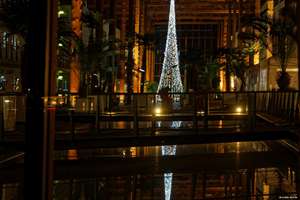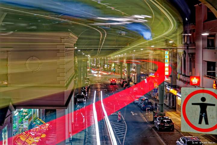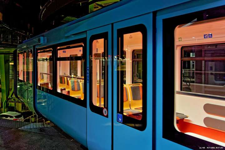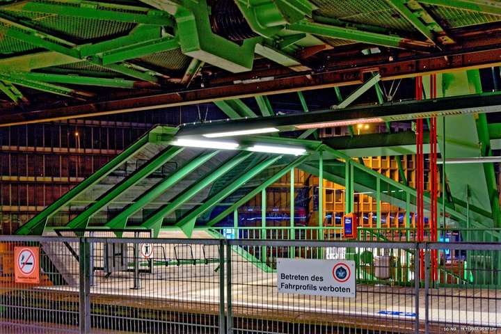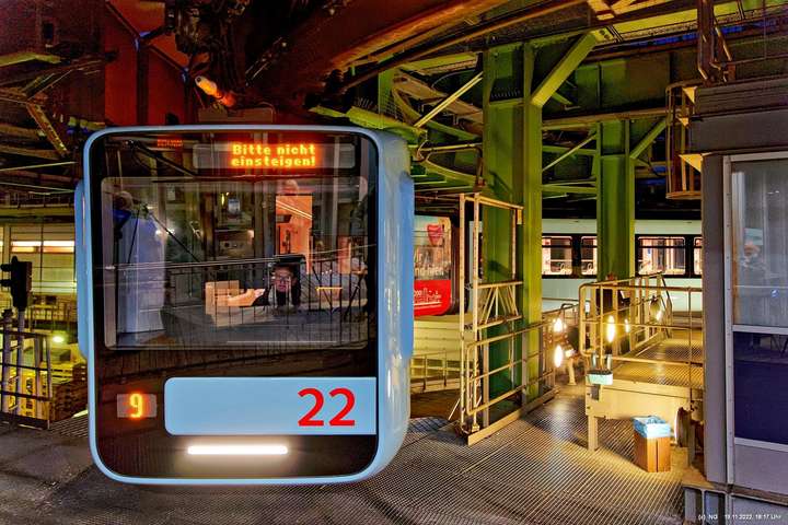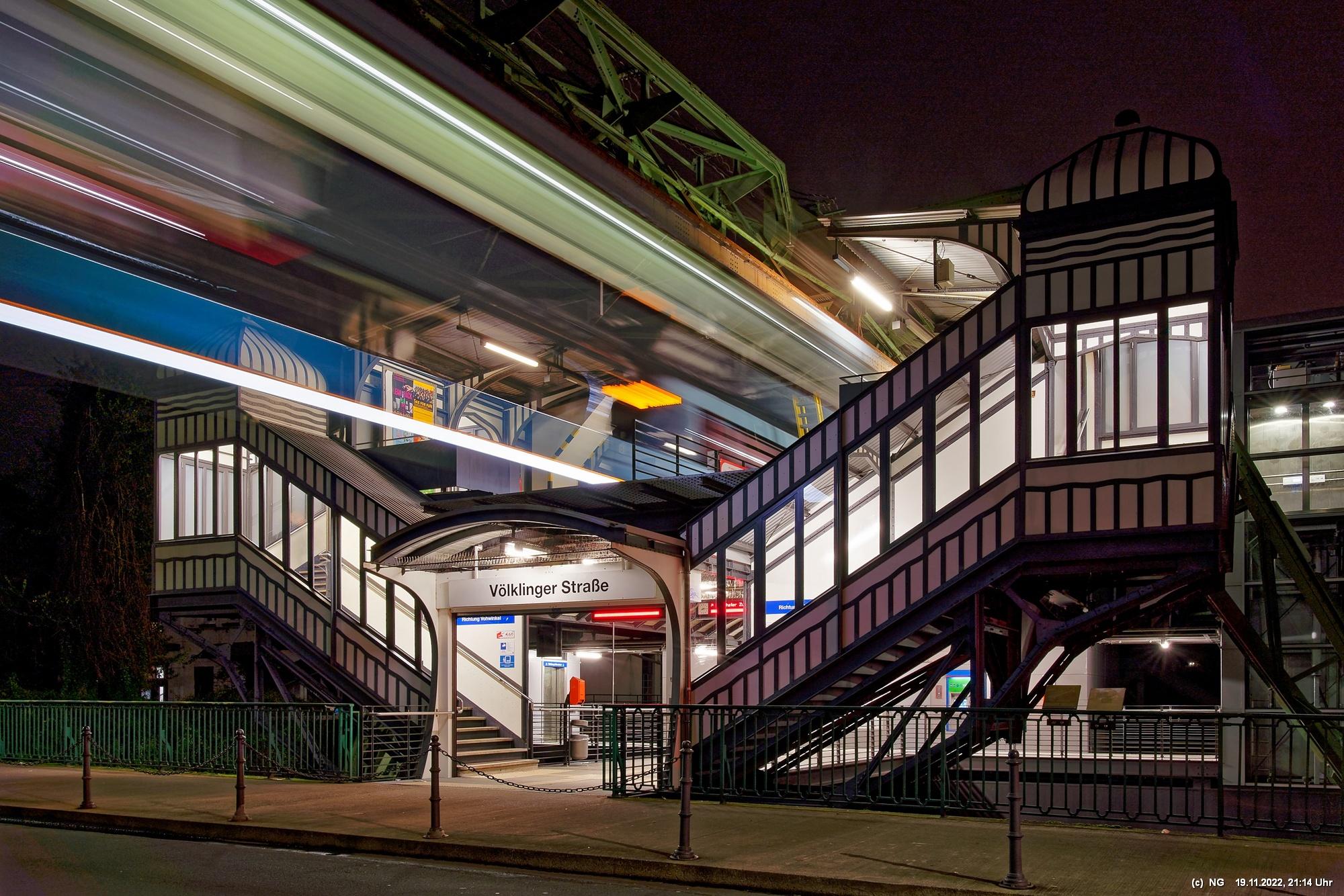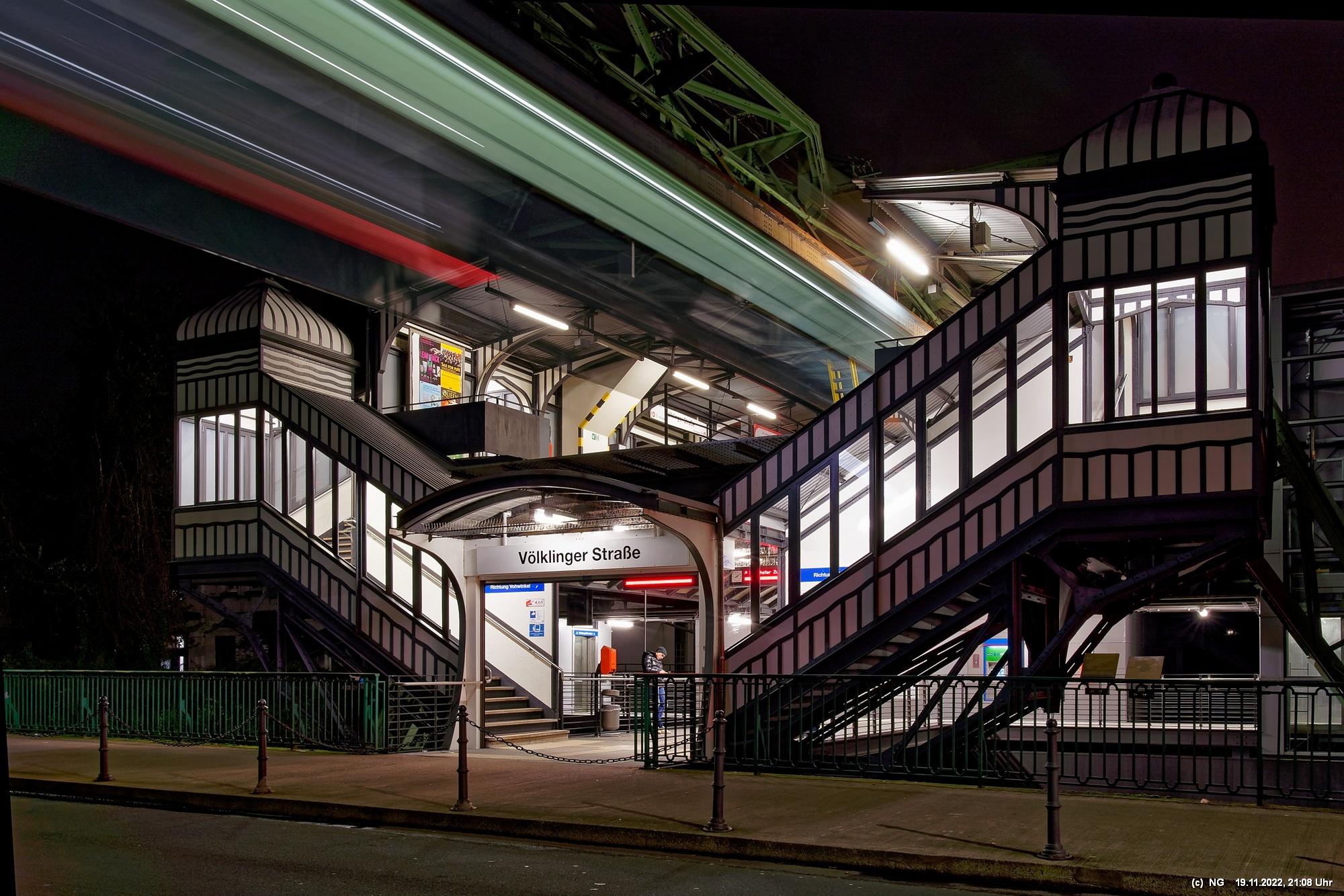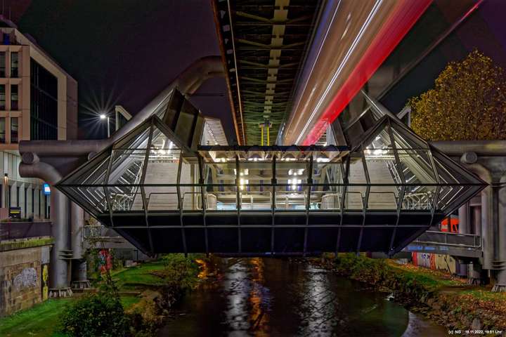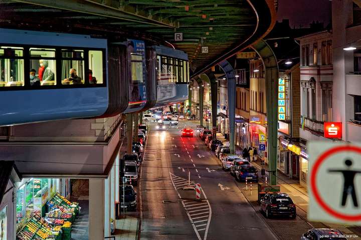 Sie wurde in 1901 als Hochbahn eröffnet. Die rund 13 km lange Strecke führt meist direkt über der Wupper und wird durch 20 Bahnhöfe in rund 35 Minuten abgefahren. Dann geht's wieder zurück. Täglich nutzen rund 80.000 Fahrgäste die Schwebebahn, die eigentlich nicht schwebt, sondern hängend über Schienen fährt. Mit der Fotogruppe "Revierblicke" haben wir bei leichtem Frost der Schwebebahn einen nächtlichen Besuch abgestattet.