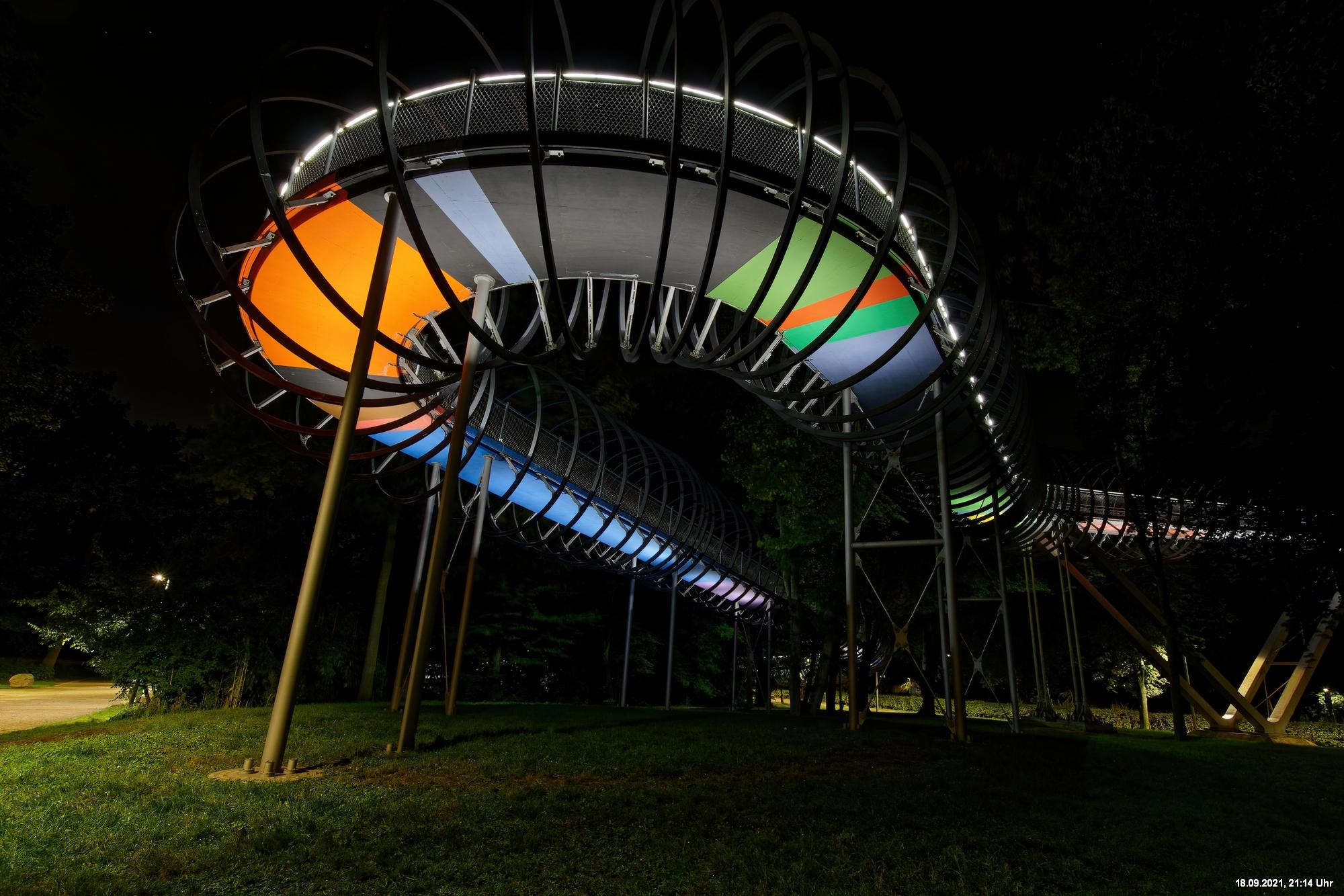 Anlässlich der Feierlichkeiten wird der Doppelbock in den Landesfarben beleuchtet.
