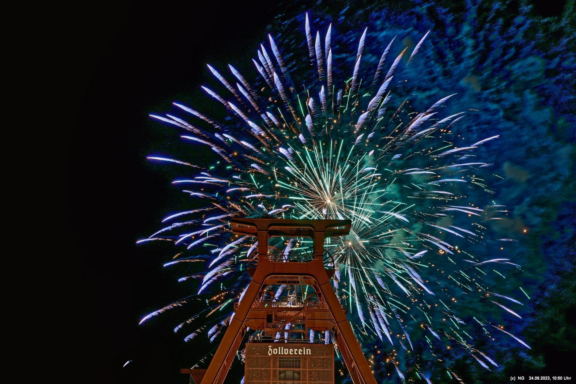 Feuerwerk am Samstagabend zum Zechenfest auf Welterbe Zollverein in Essen.